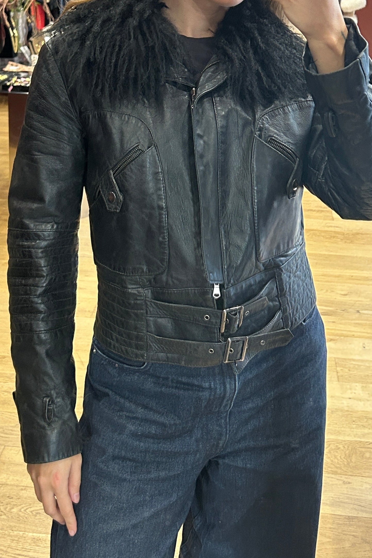 Vintage Black Cropped Biker Leather Jacket
