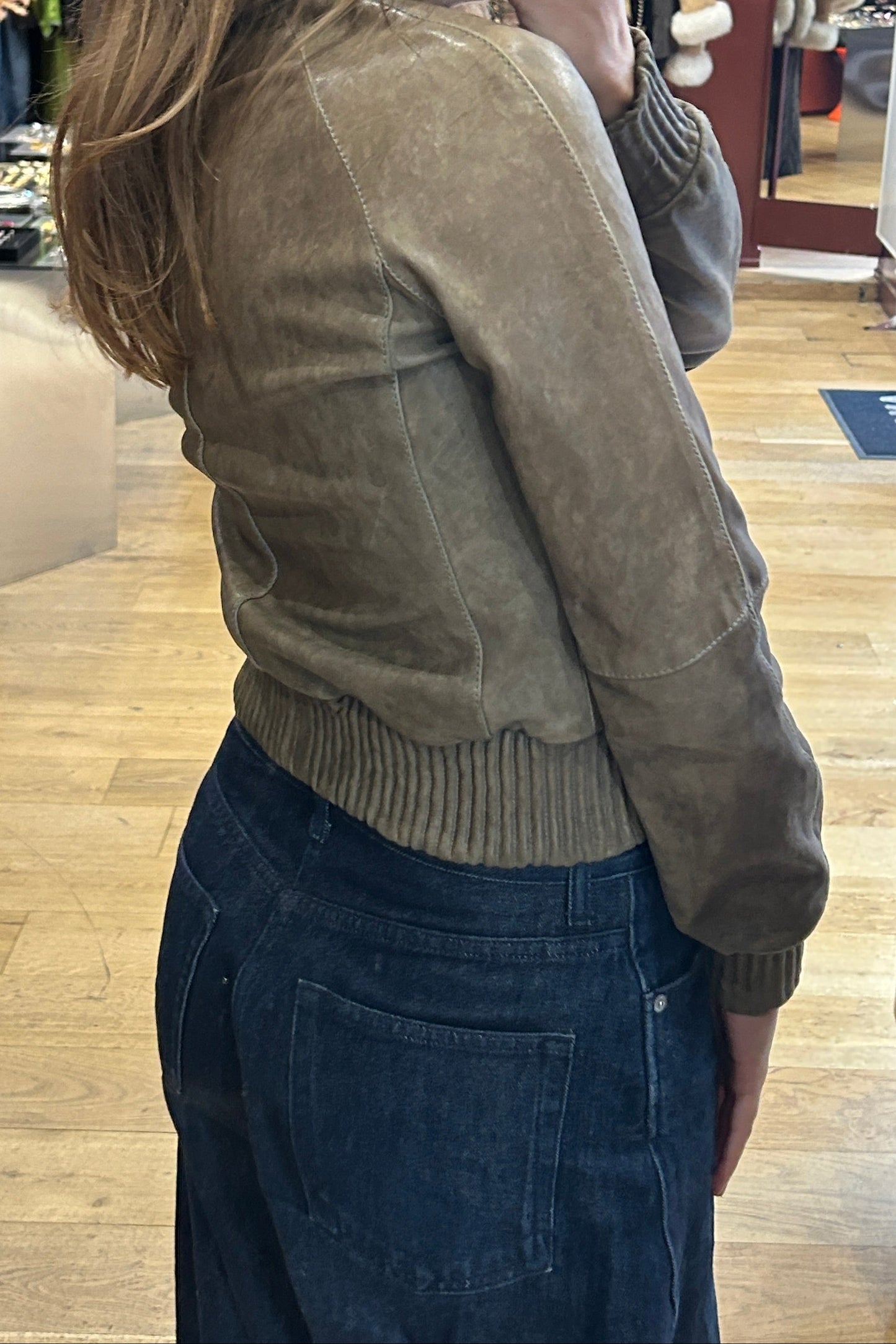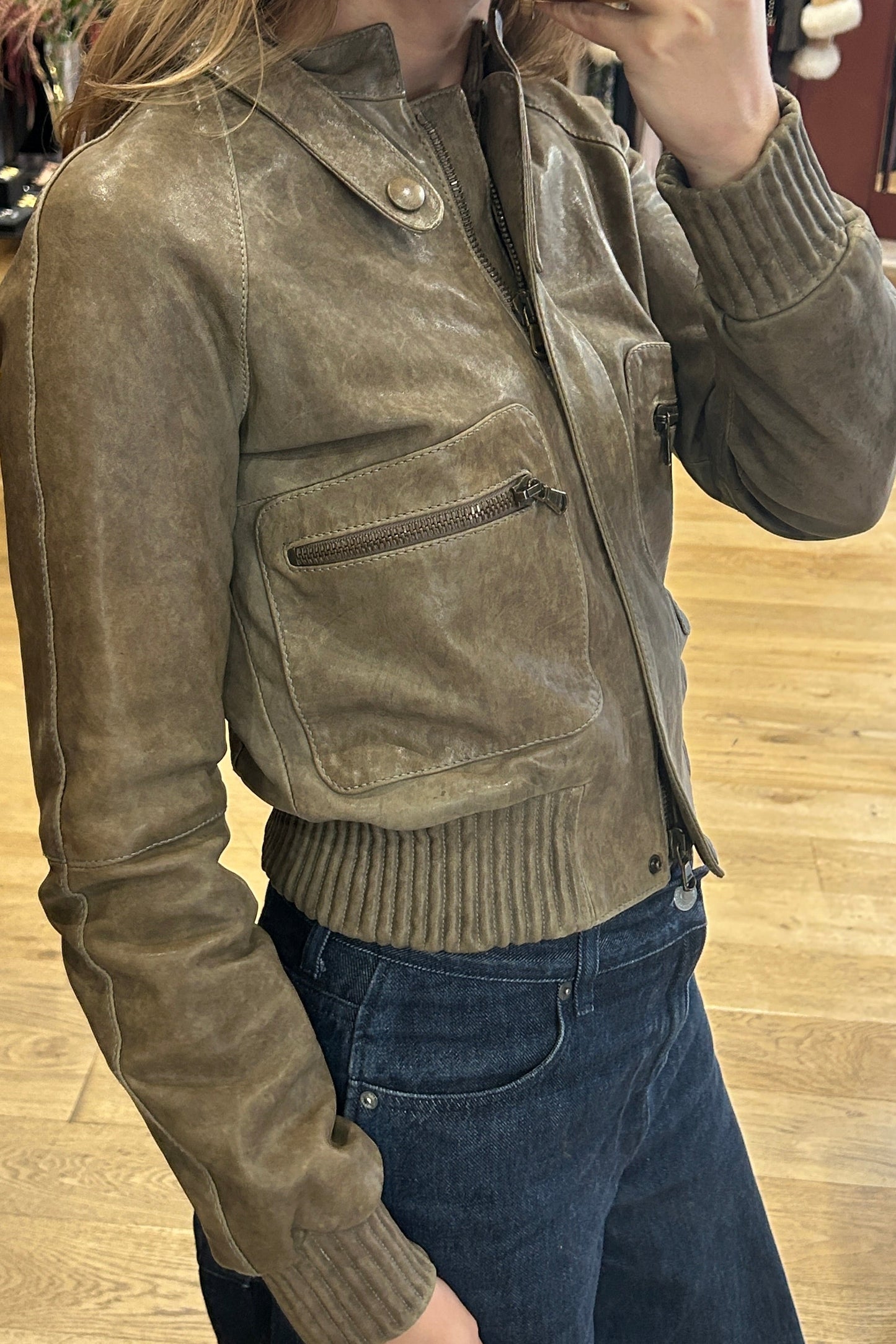 A stylish early-2000s cropped leather jacket crafted in soft beige leather. The design features ribbed trims that add a sporty yet structured touch, creating a flattering fitted silhouette. Its cropped cut makes it perfect for layering and gives it an effortless Y2K vibe.