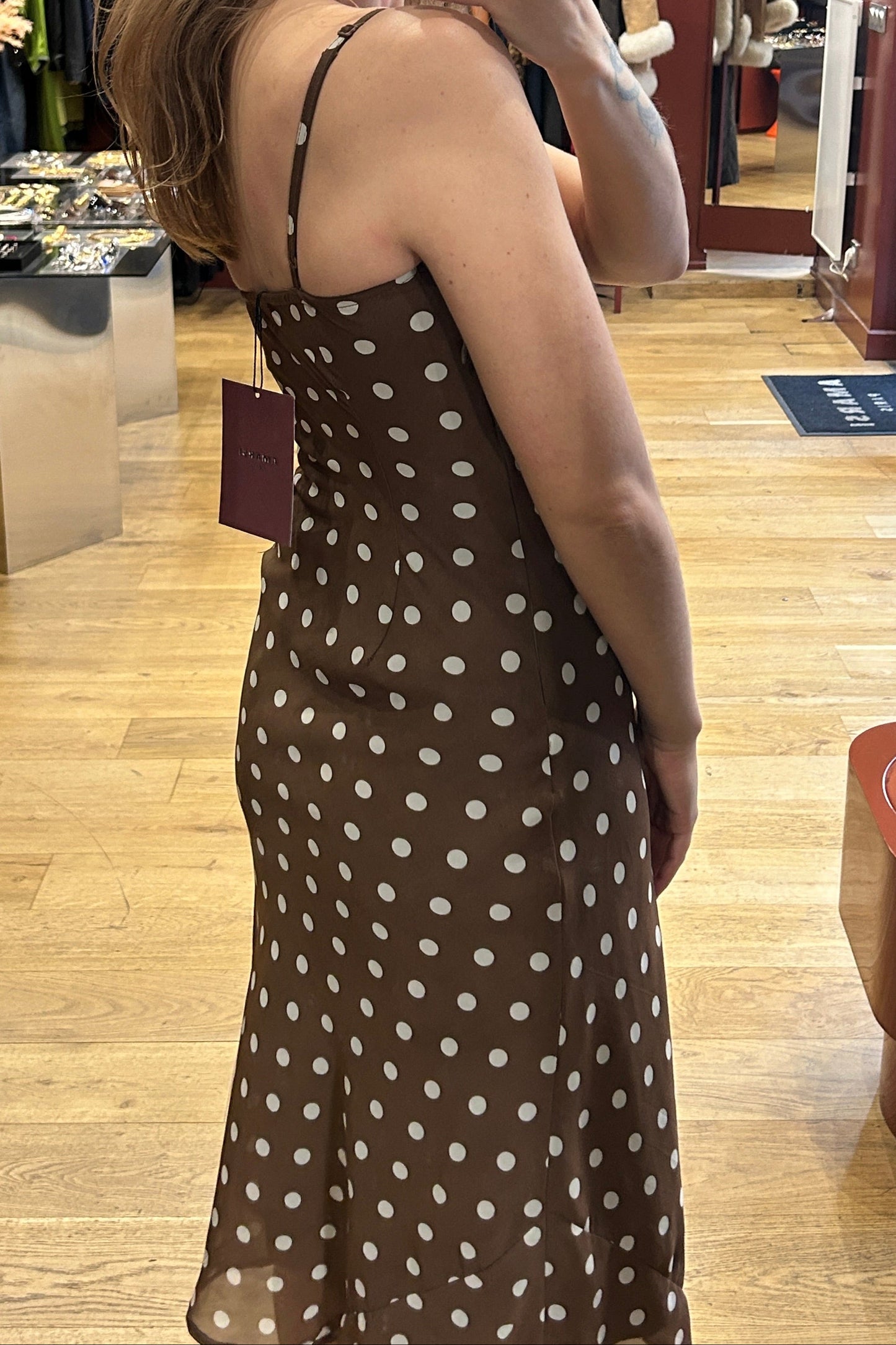 This charming 2000s slip dress features a playful white polka dot pattern over a rich brown background. Lightweight and fluid, it is crafted from synthetic fabric that drapes softly for an effortless silhouette.
