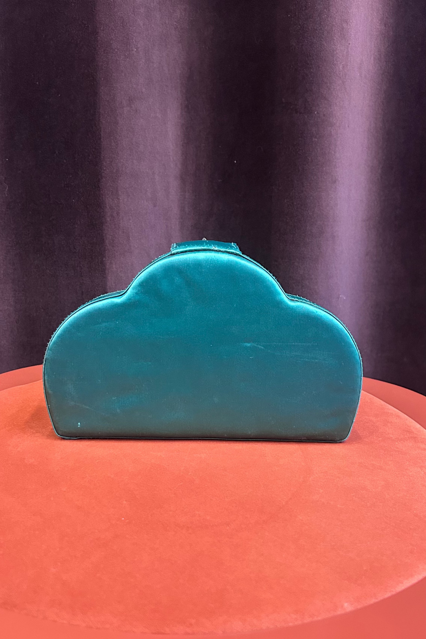 Elegant and distinctive, this rigid green satin clutch by Italian brand Maddalena Marconi stands out for its sculptural cloud-shaped silhouette.