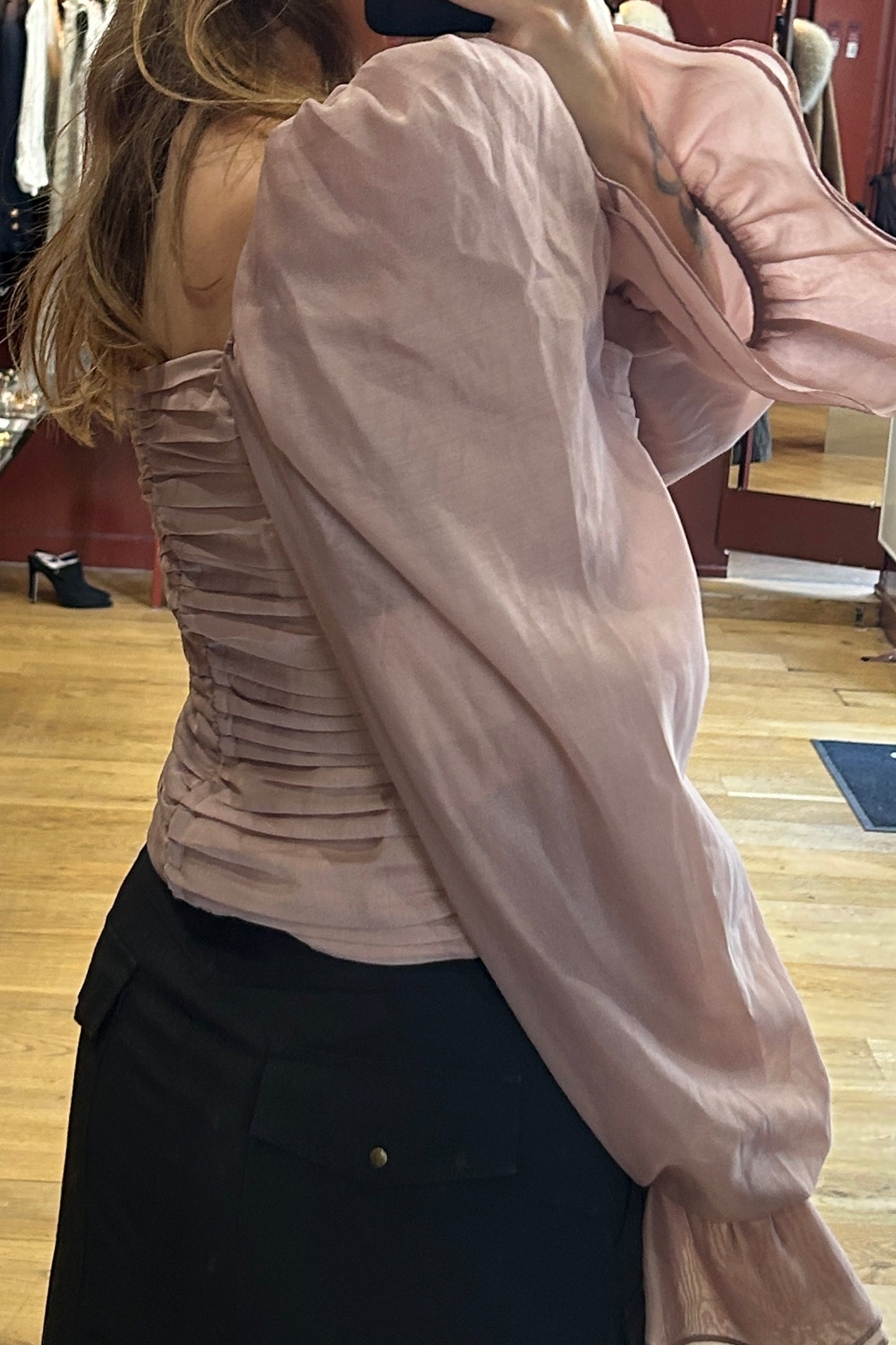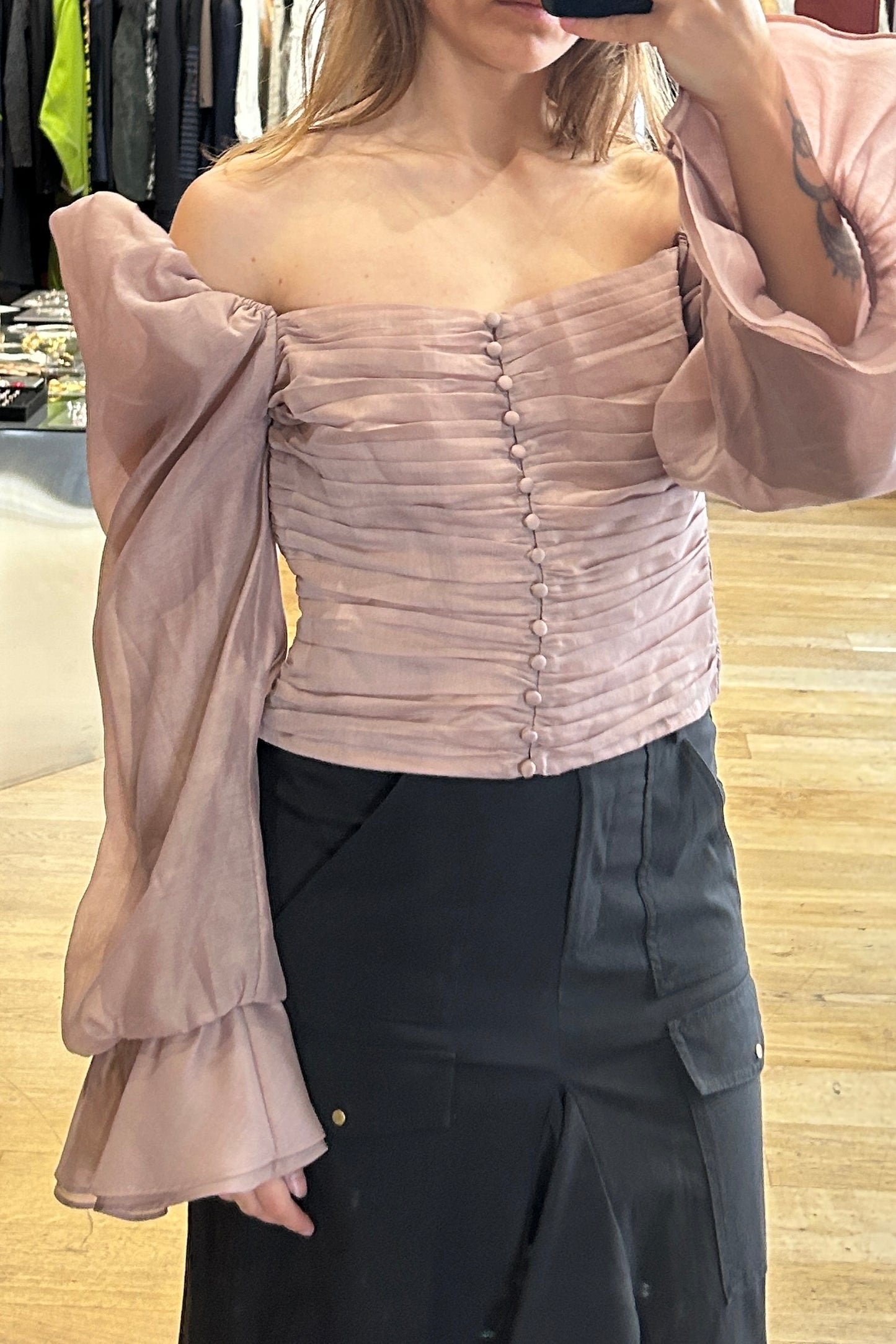 Details: Balloon sleeves (can be worn on or off the shoulders), ruched front, small front buttons