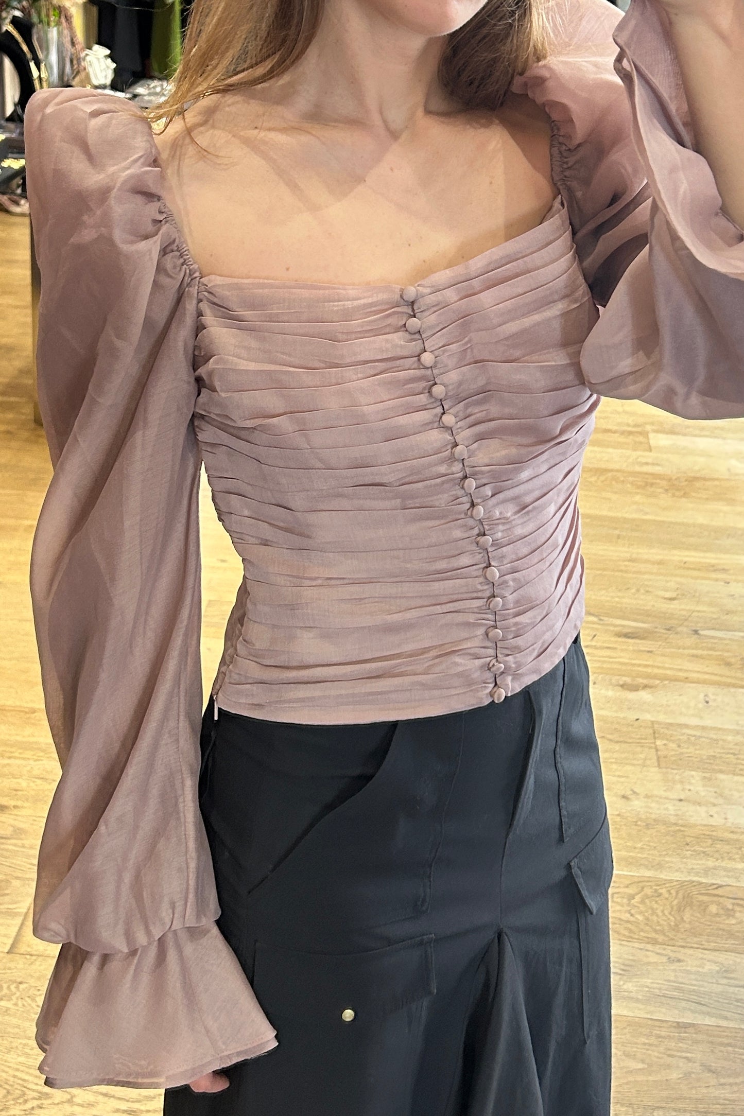 The design features voluminous balloon sleeves that can be worn traditionally or styled off the shoulders for a more alluring, fashion-forward look. The front is beautifully gathered with delicate ruching and finished with small buttons, adding texture and subtle vintage-inspired charm.