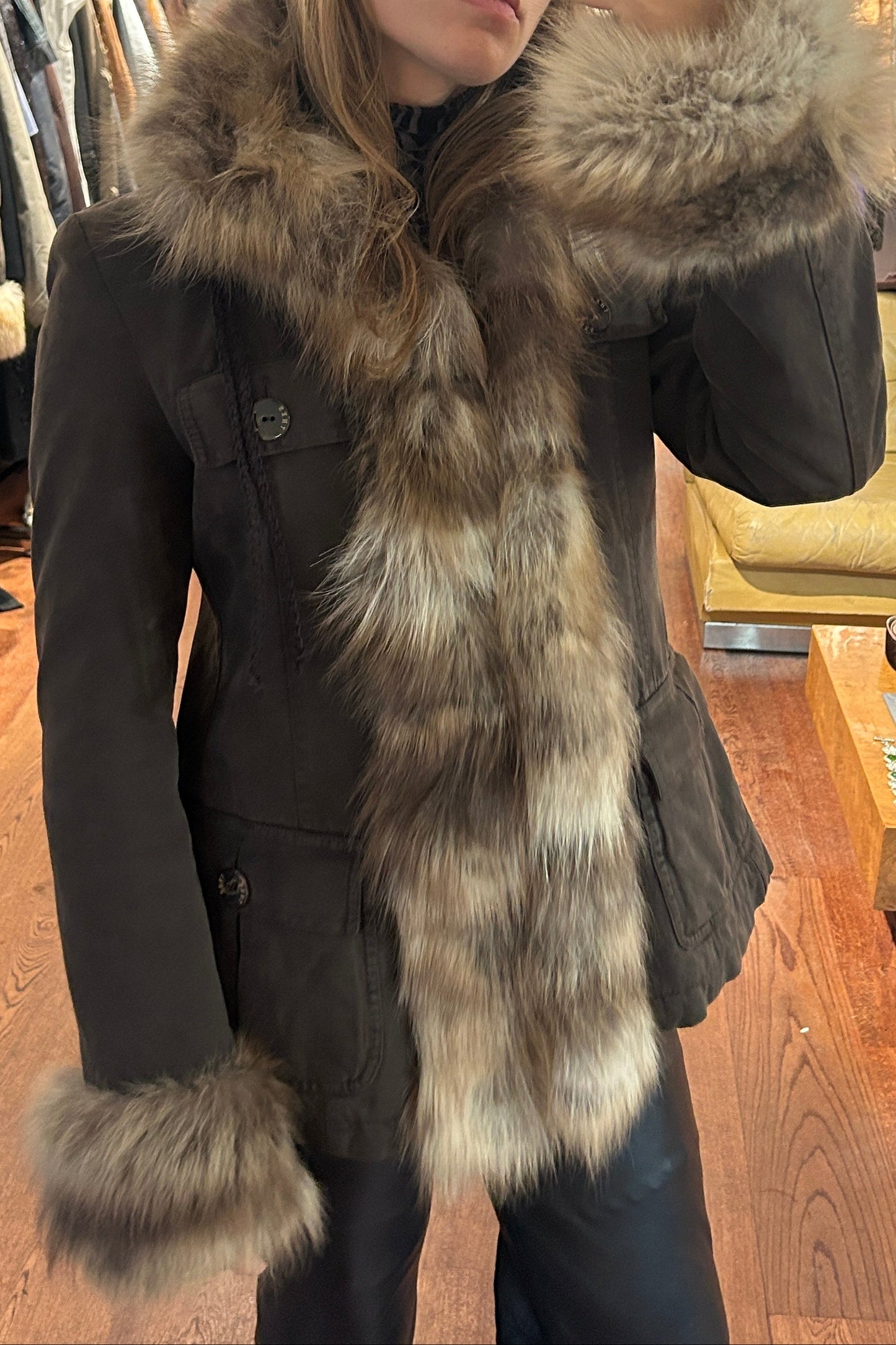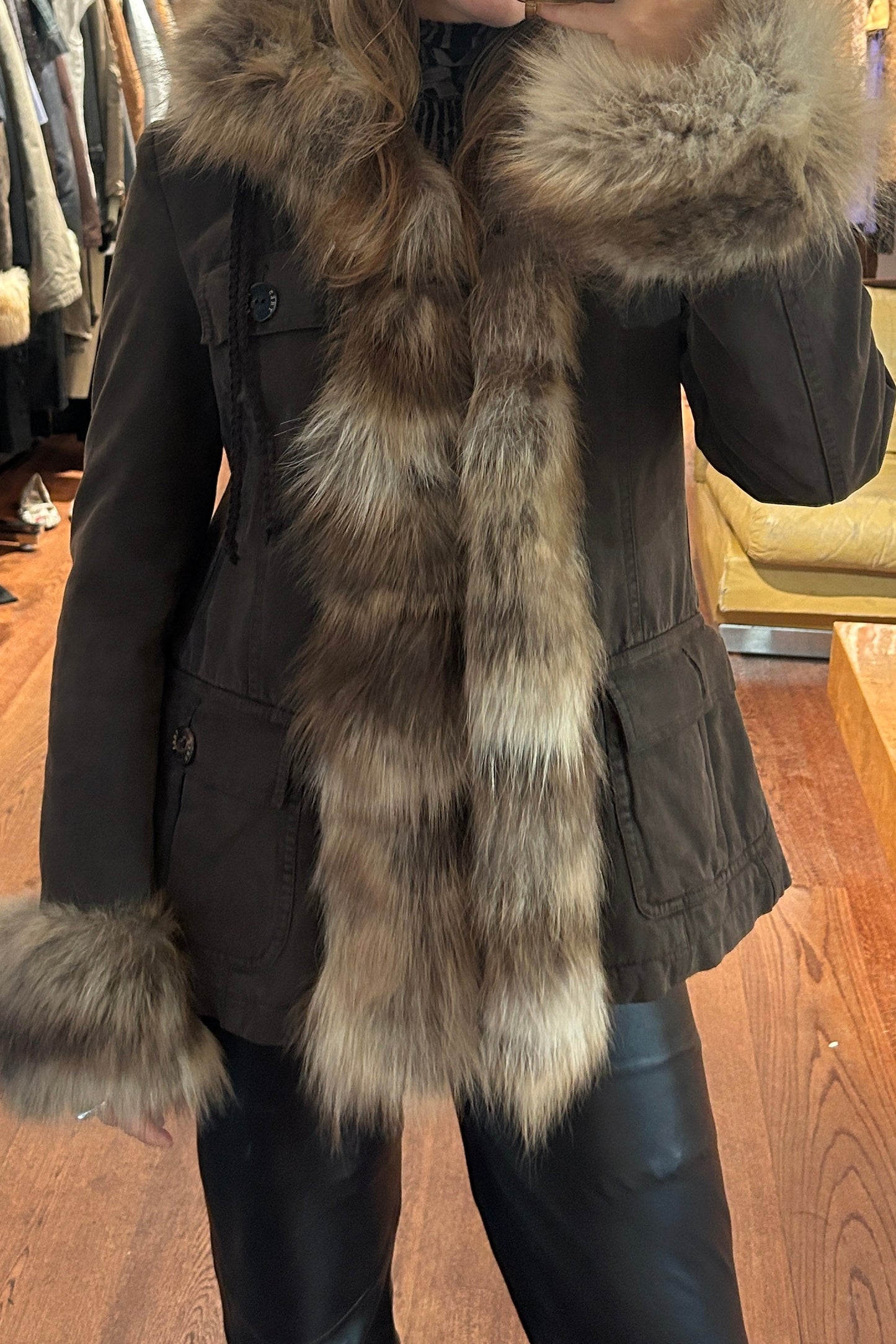 Vintage Brown Coat with Fox Fur Trim on Collar & Sleeves