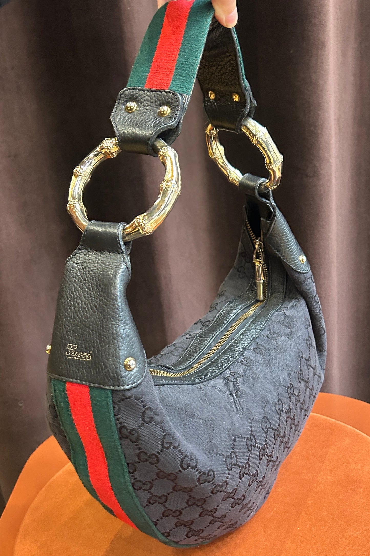 Vintage Gucci Black Canvas Hobo Bag with Web Strap Bamboo Rings