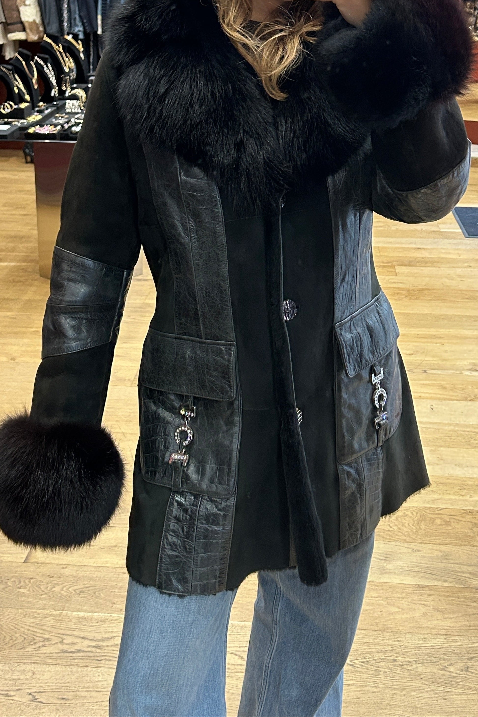 Elegant and luxurious, this black coat features soft fox fur on the exterior with a cozy sheepskin lining for warmth and comfort. Designed with functional pockets adorned with subtle rhinestones, and accented with sleek leather panels, it perfectly combines opulence with refined detailing.