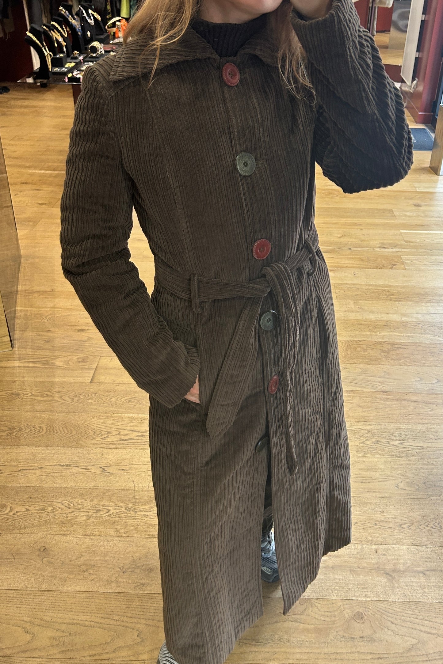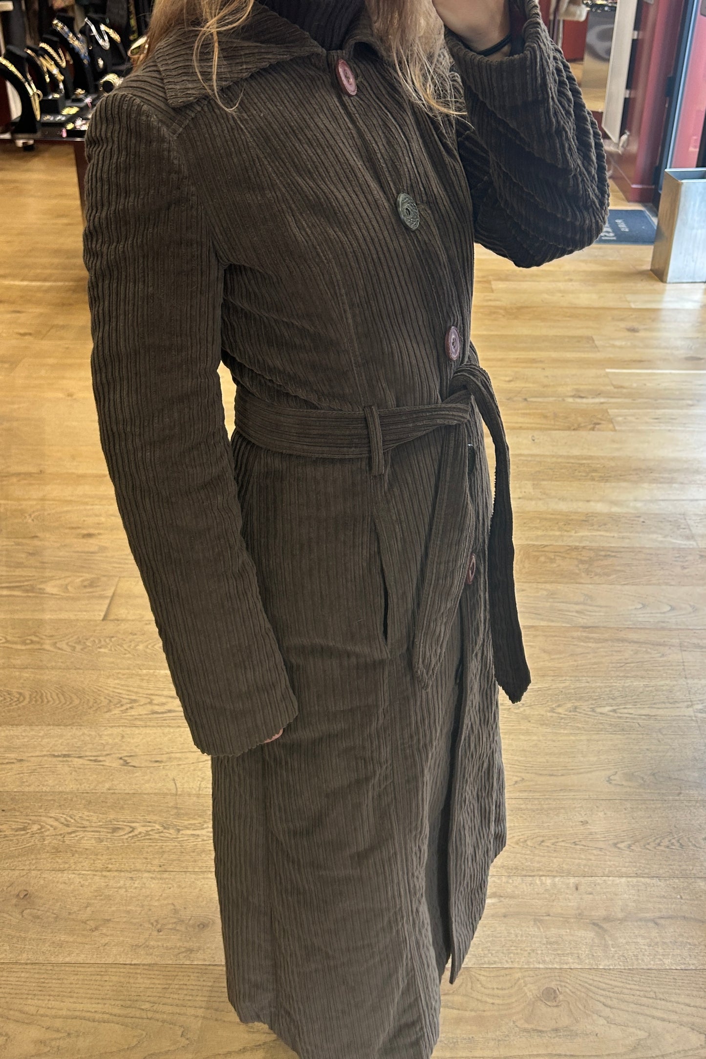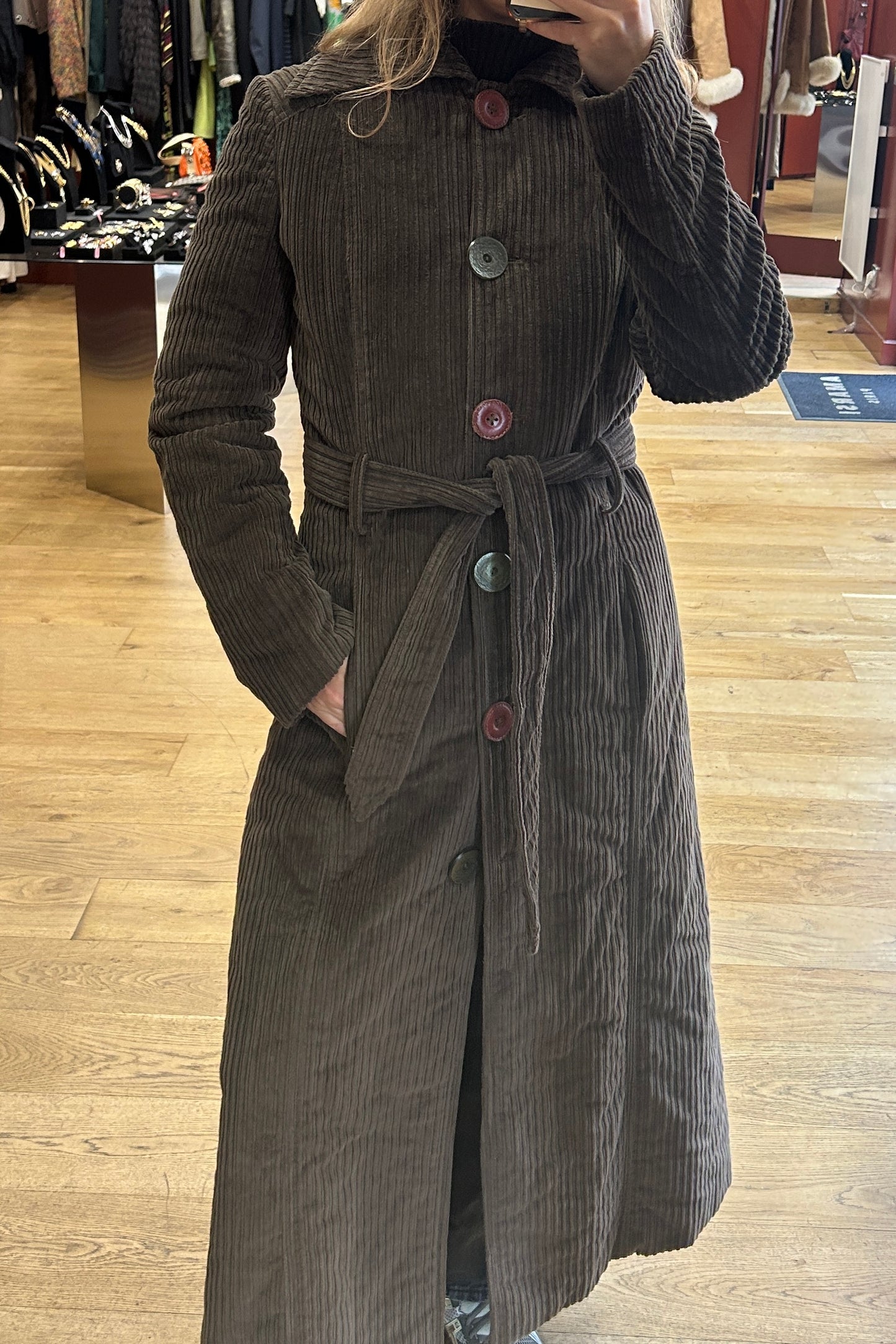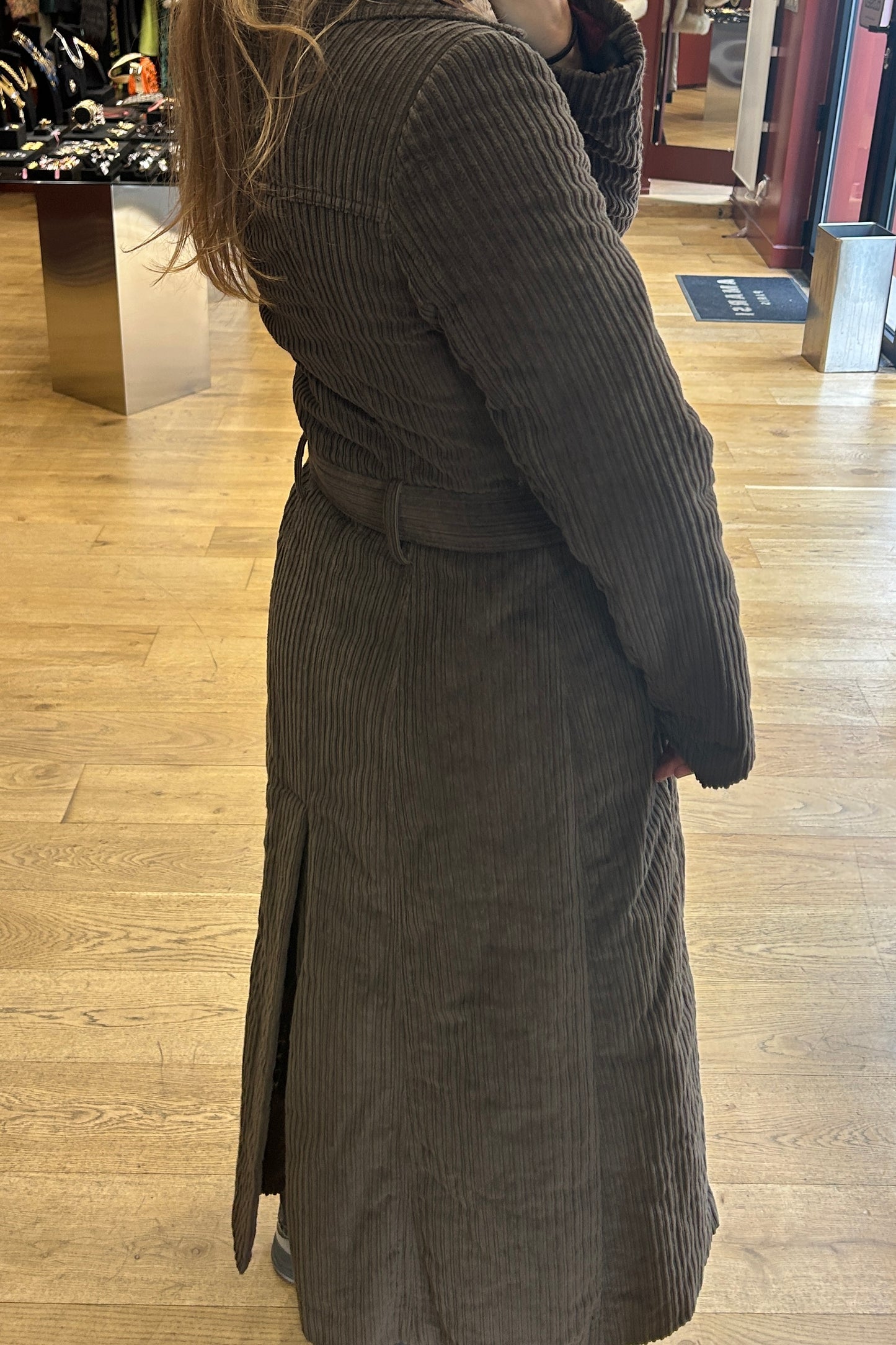 This elegant D&G long coat is crafted from khaki corduroy, offering a refined and timeless look with a soft, textured feel. Designed with a front button closure and a matching belt that cinches the waist, it creates a flattering, tailored silhouette while maintaining a chic, classic appeal.