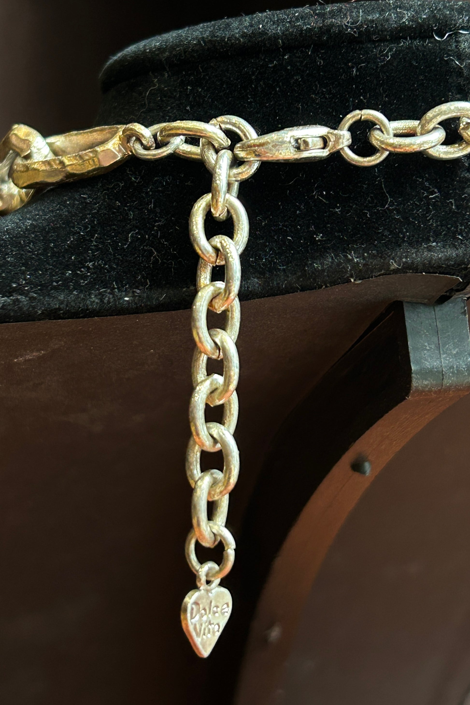 A dazzling Y2K piece from Docevita, this silver-tone necklace features a bold chain-style design accented with delicate rhinestone details for added sparkle. The adjustable back closure allows for a perfect fit, whether worn as a choker or a slightly longer statement necklace. In excellent vintage condition, it shows only the subtle rosy reflections typical of aged silver-tone metals — adding charm without detracting from its shine. A striking, glamorous accessory ideal for evening looks or elevating everyday outfits.