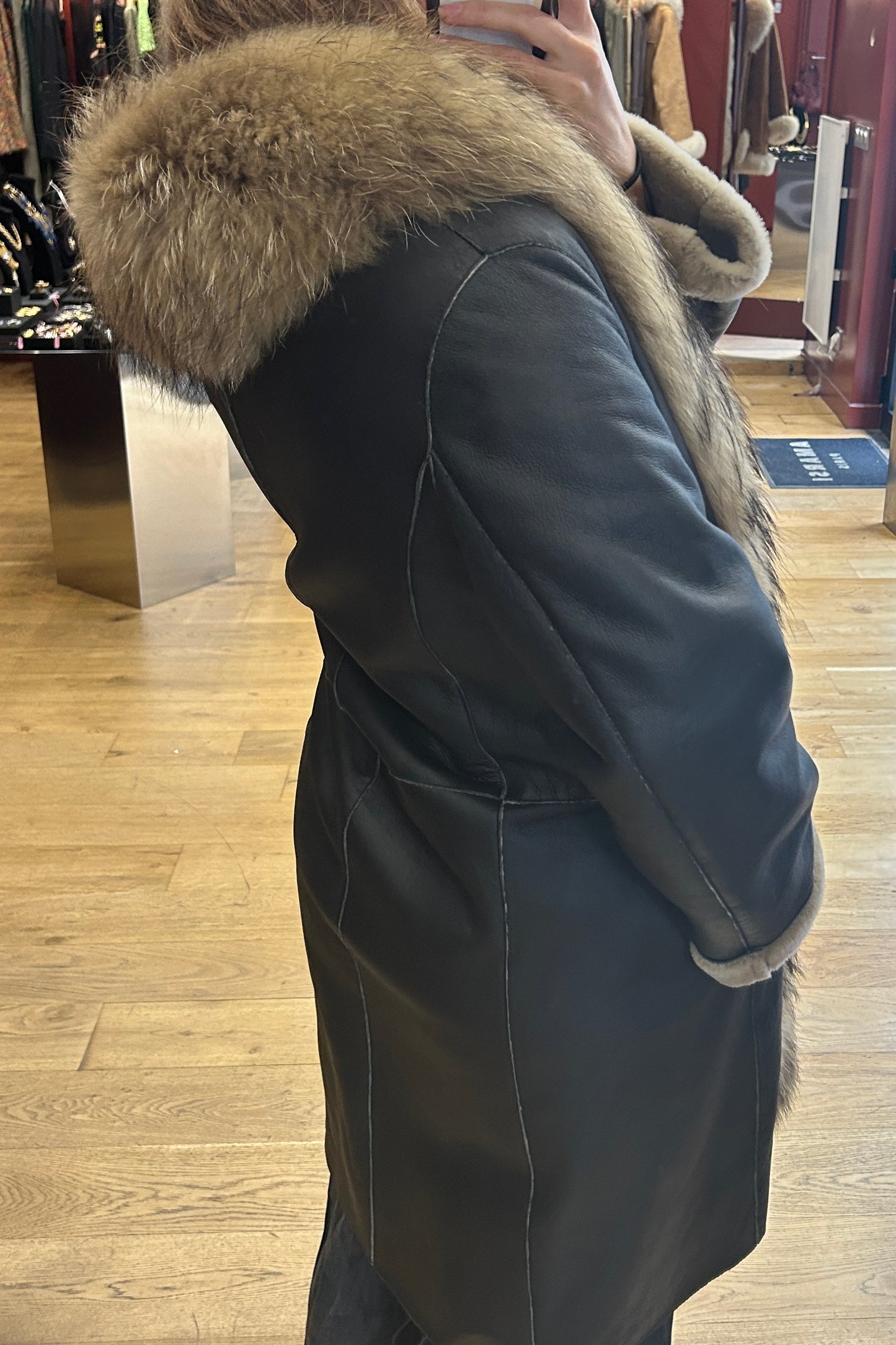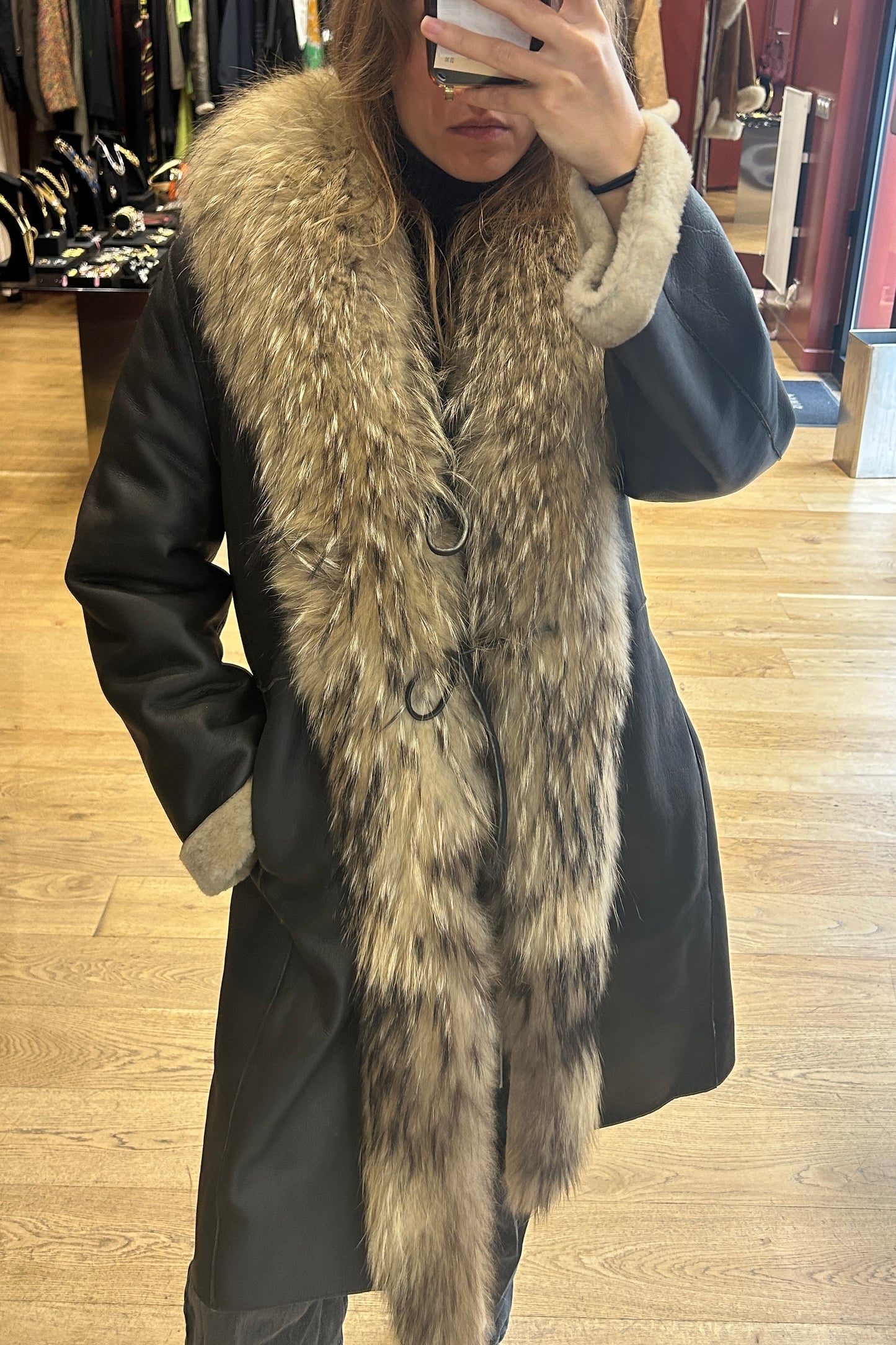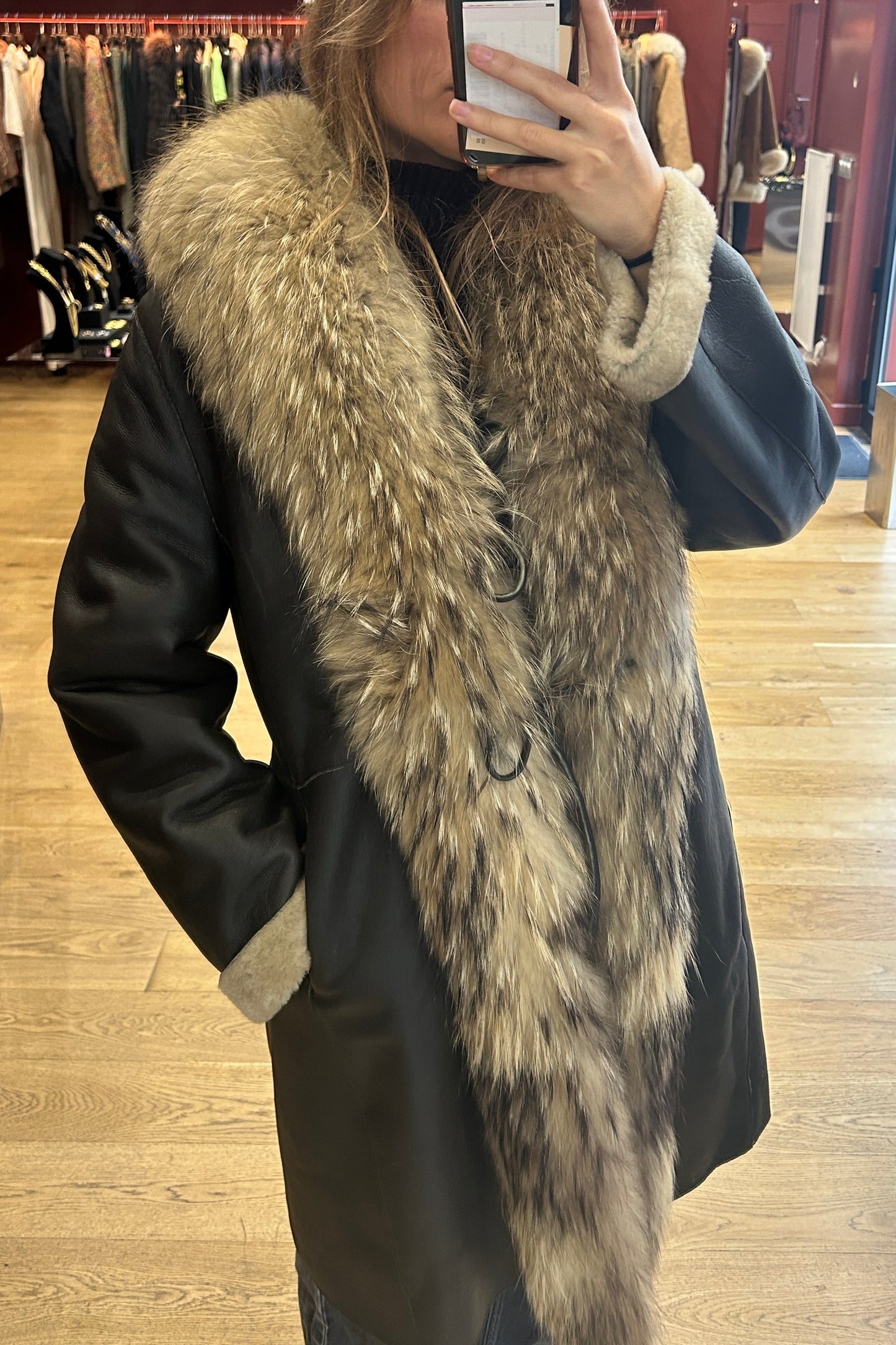 Material: Leather with fox fur trim and shearling
