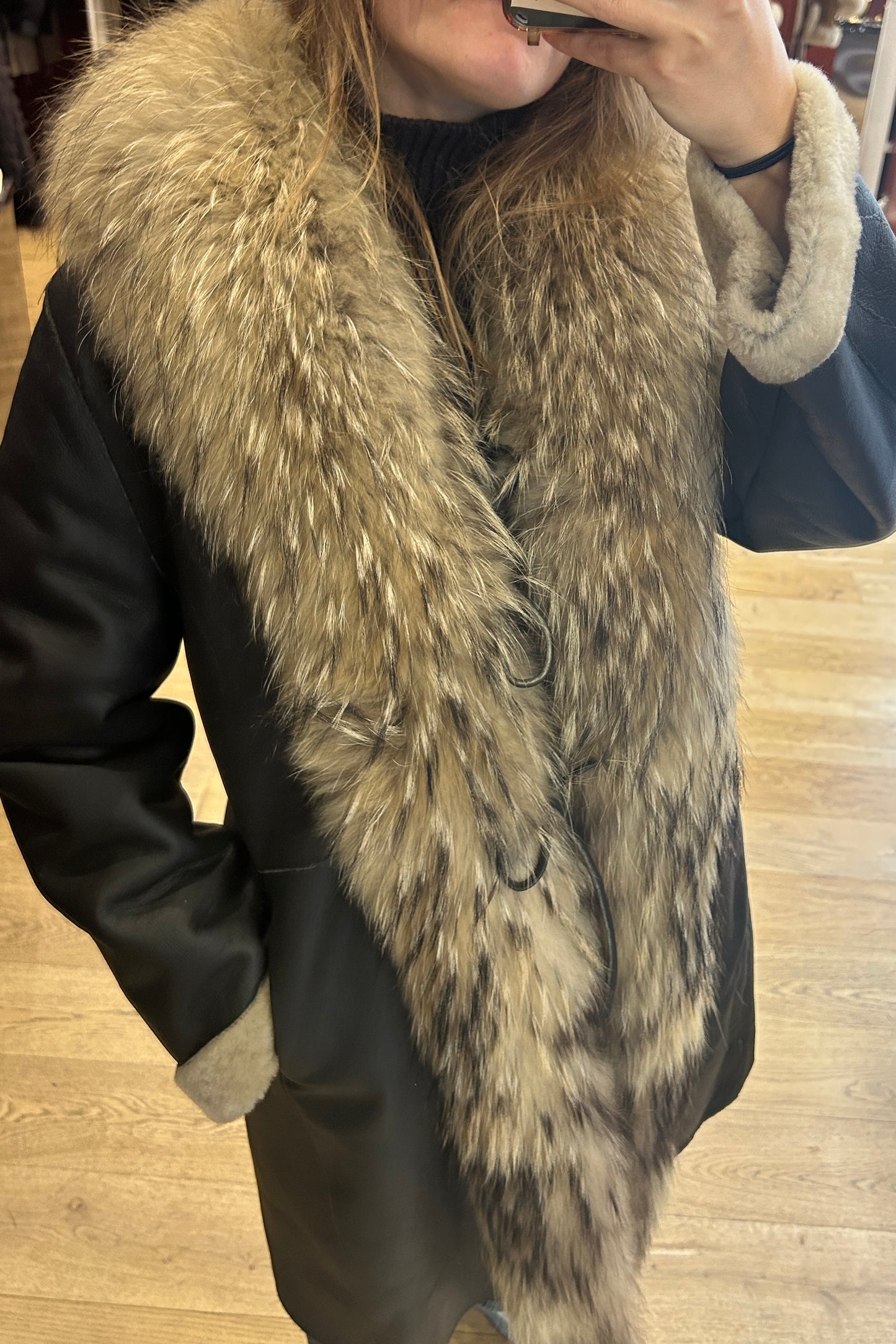 This luxurious long coat is crafted from rich brown leather and features lavish fox fur detailing along the collar and cuffs, creating a timeless and glamorous winter piece. Fully lined with soft shearling (sheepskin) for maximum warmth, it offers both comfort and elegance in equal measure.