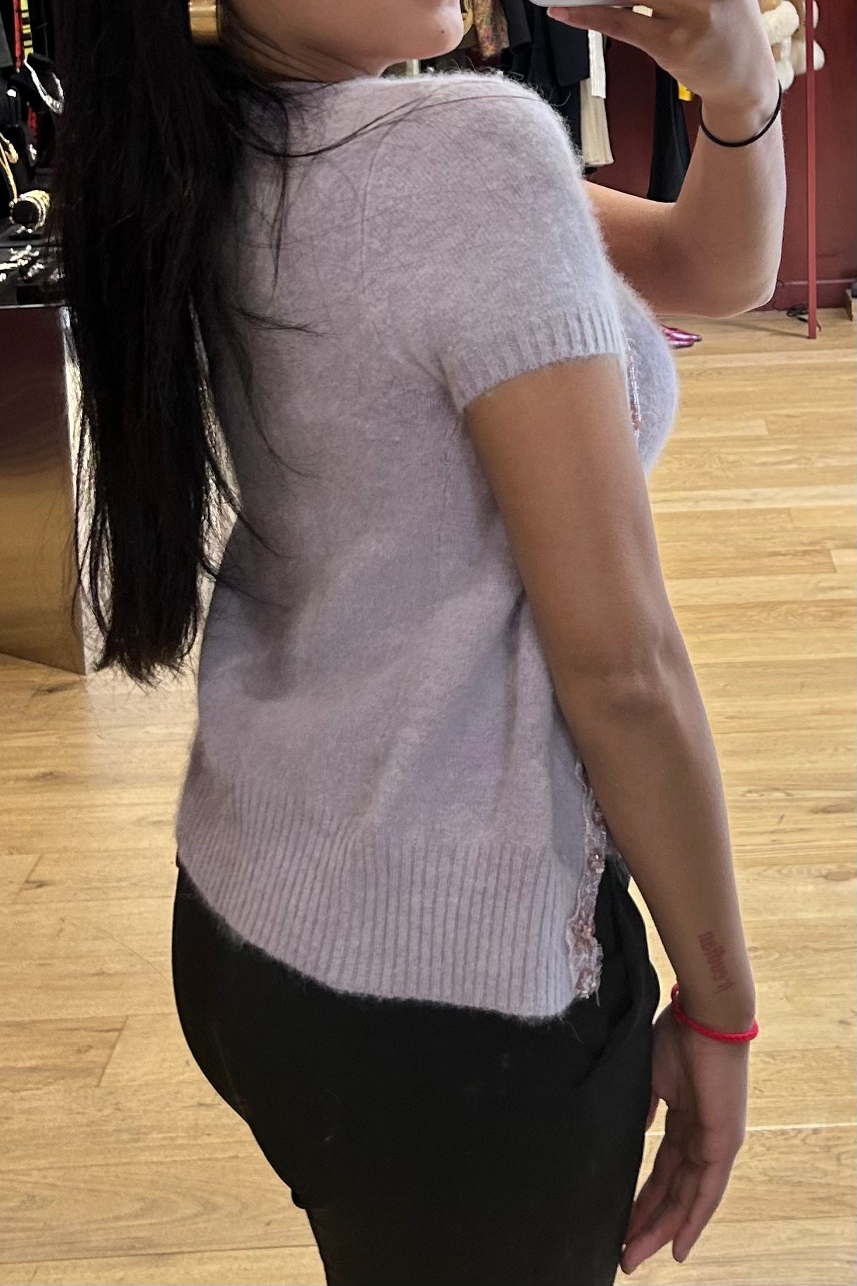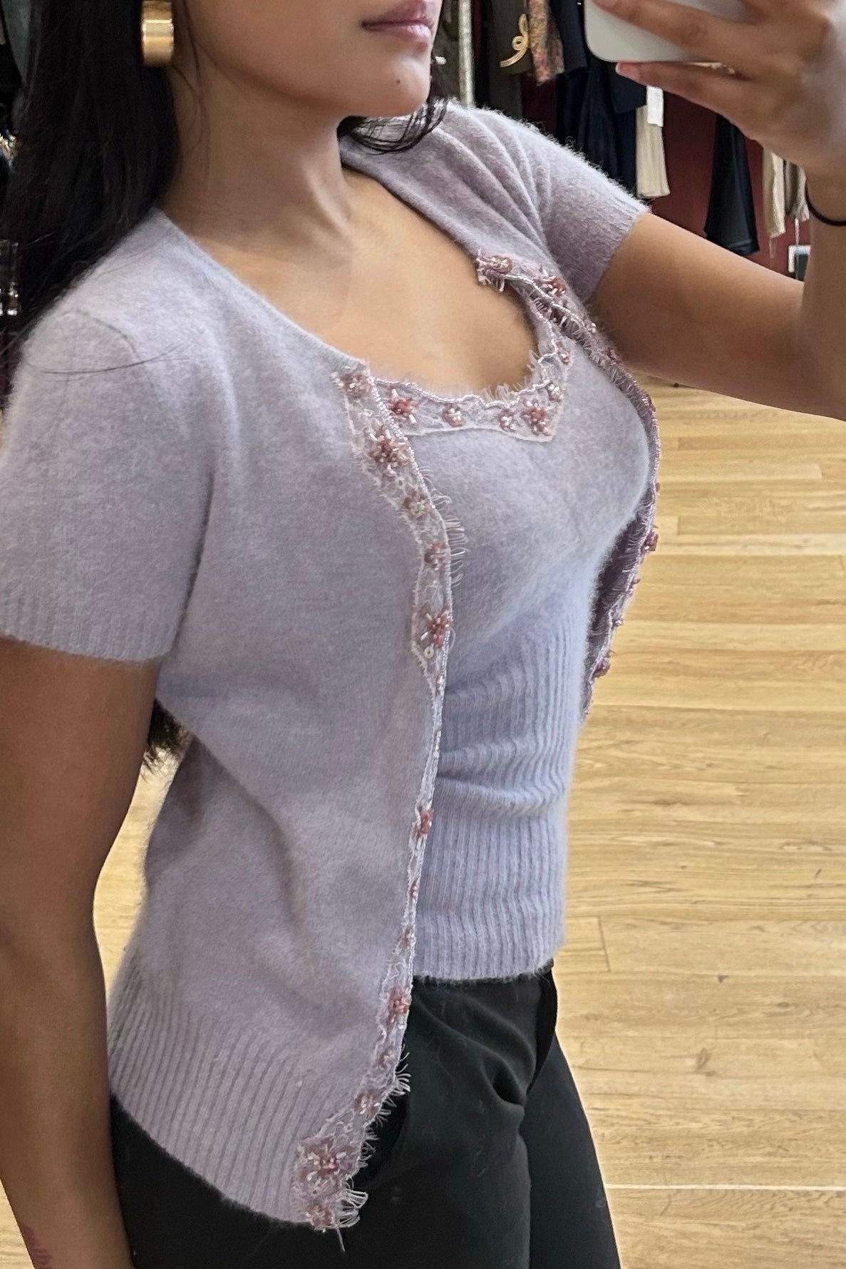 Really cute and feminine, this vintage twinset from the 2000s is crafted from soft mauve angora and adorned with delicate floral rhinestone details. The set offers a cozy yet elegant look, perfectly capturing the romantic Y2K aesthetic.