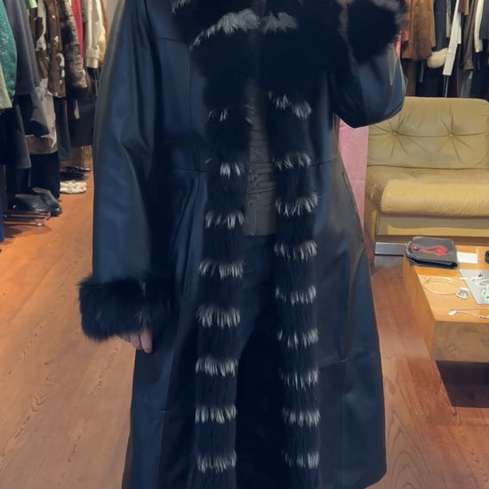 Elegant and statement-making, this vintage long leather coat from the 1990s embodies timeless sophistication with a bold edge. Crafted from smooth black leather, it features a luxurious fox fur trim running along the full length of the collar, showcasing striking black and white tones that add depth and contrast.