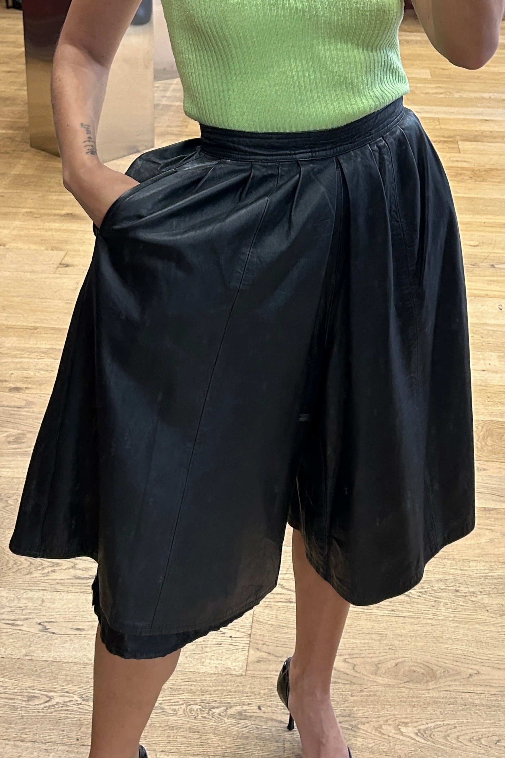 Bold and effortlessly stylish, these 1980s black leather bermuda shorts feature a culotte-style silhouette, combining the structure of shorts with the elegance of a skirt. Crafted from supple leather, they offer both comfort and a sophisticated vintage edge.