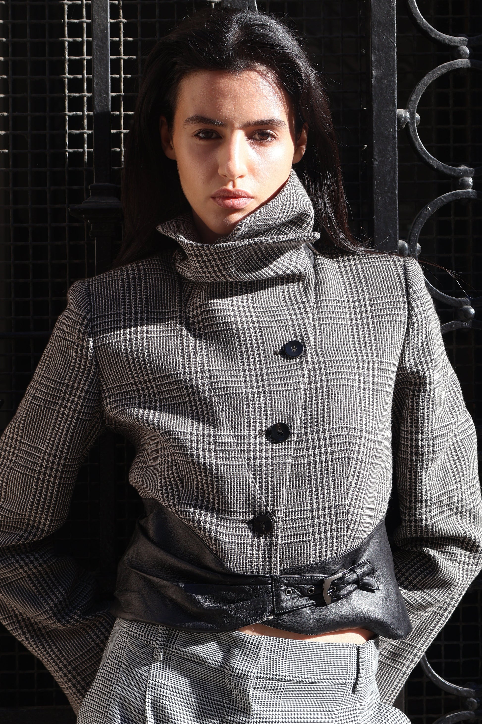 A refined and distinctive vintage piece from Armani Collezioni, this jacket blends classic Prince of Wales wool with bold leather paneling for a sophisticated and modern contrast. Featuring a buttoned front, leather detailing, a structured high collar, and a leather belt at the hem, it perfectly balances tailoring and edge, an exceptional piece for collectors and lovers of elevated vintage fashion.