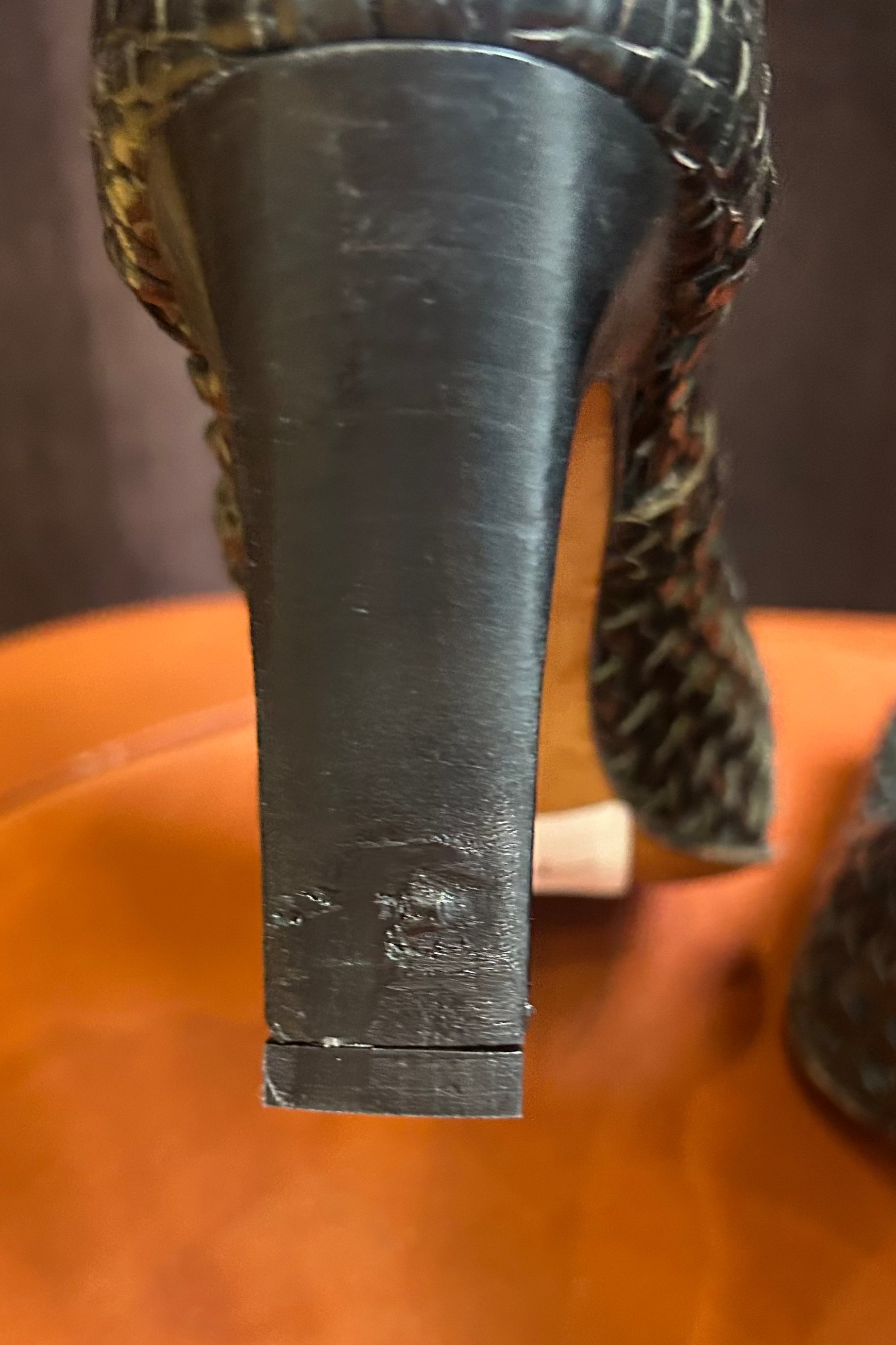Edgy and sculptural, these vintage black ankle boots are crafted in leather with an open-weave effect, giving them a striking architectural silhouette. Set on a 9 cm heel, they blend elegance and attitude, creating the perfect statement piece for bold, fashion-forward looks.