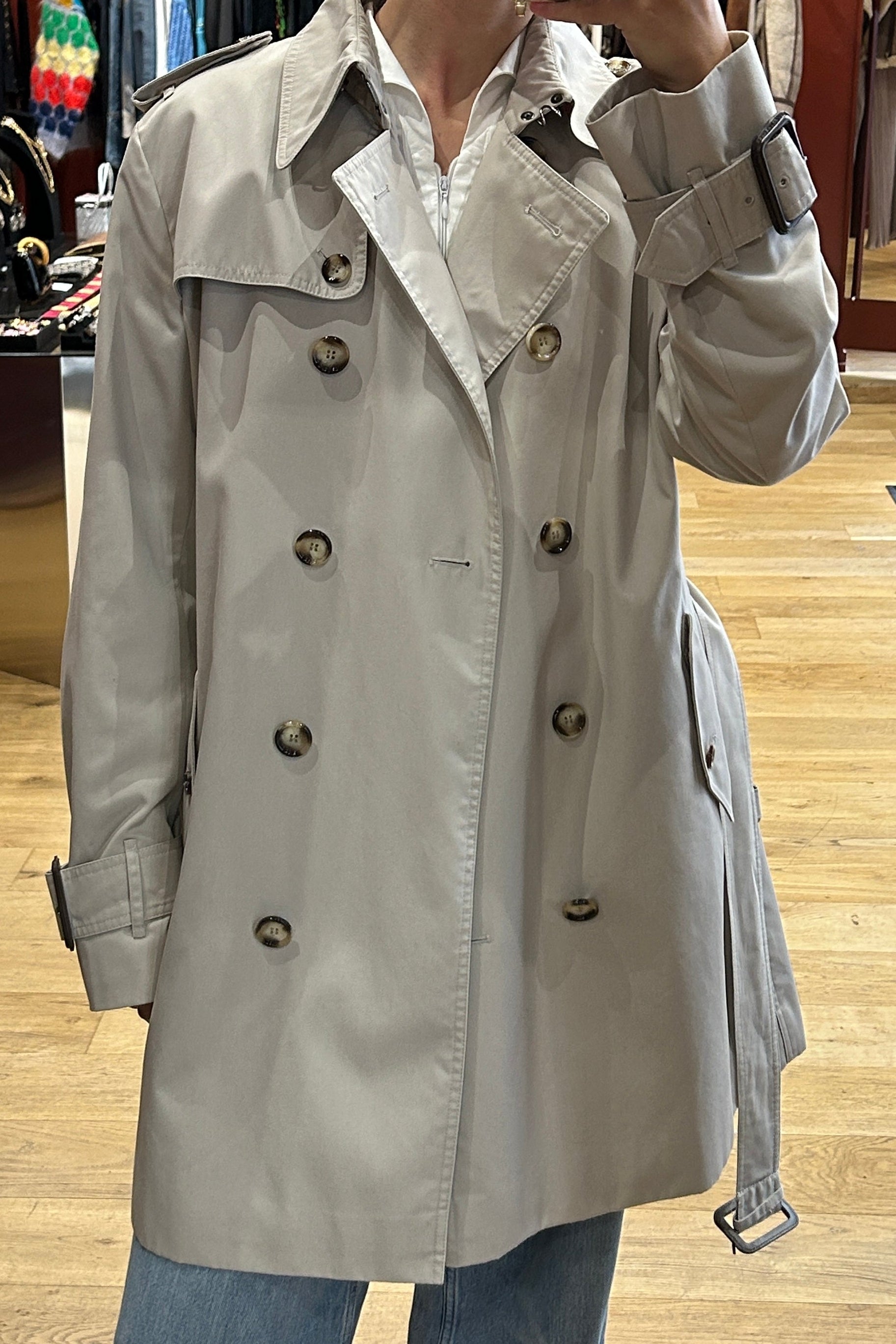 Timeless and refined, this Burberry trench coat is crafted in light beige cotton, featuring the brand’s iconic double-breasted front and matching waist belt. Its mid-length silhouette and impeccable tailoring make it a true wardrobe essential, embodying the elegance and functionality that define Burberry’s heritage.