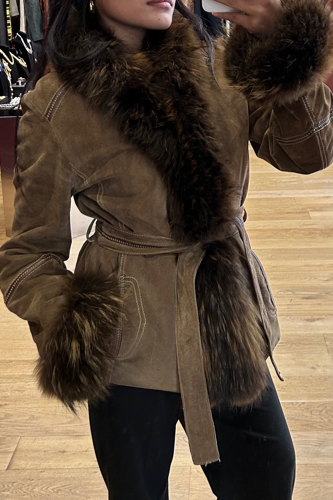 This gorgeous Combipel jacket from the 2000s combines soft light brown suede with luxurious dark brown fox fur accents for a sophisticated and cozy look. Designed with an integrated suede belt, it cinches the waist beautifully while maintaining a polished silhouette.