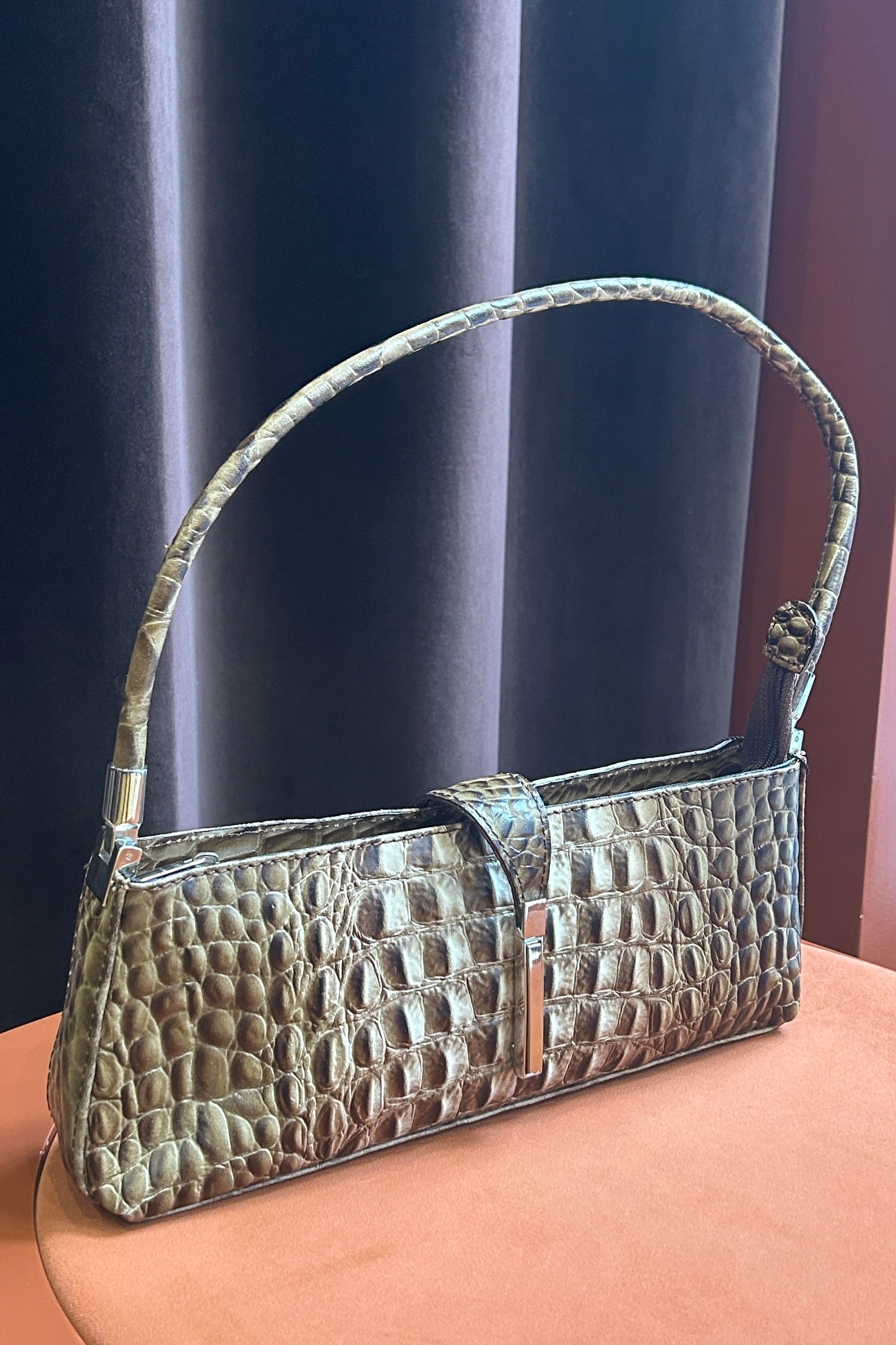 Chic and compact, this vintage baguette bag from the late 1990s–early 2000s is crafted from croc-embossed leather in elegant brown and beige tones. Designed to be worn on the shoulder, it features the perfect size for evenings out while remaining practical and stylish.
