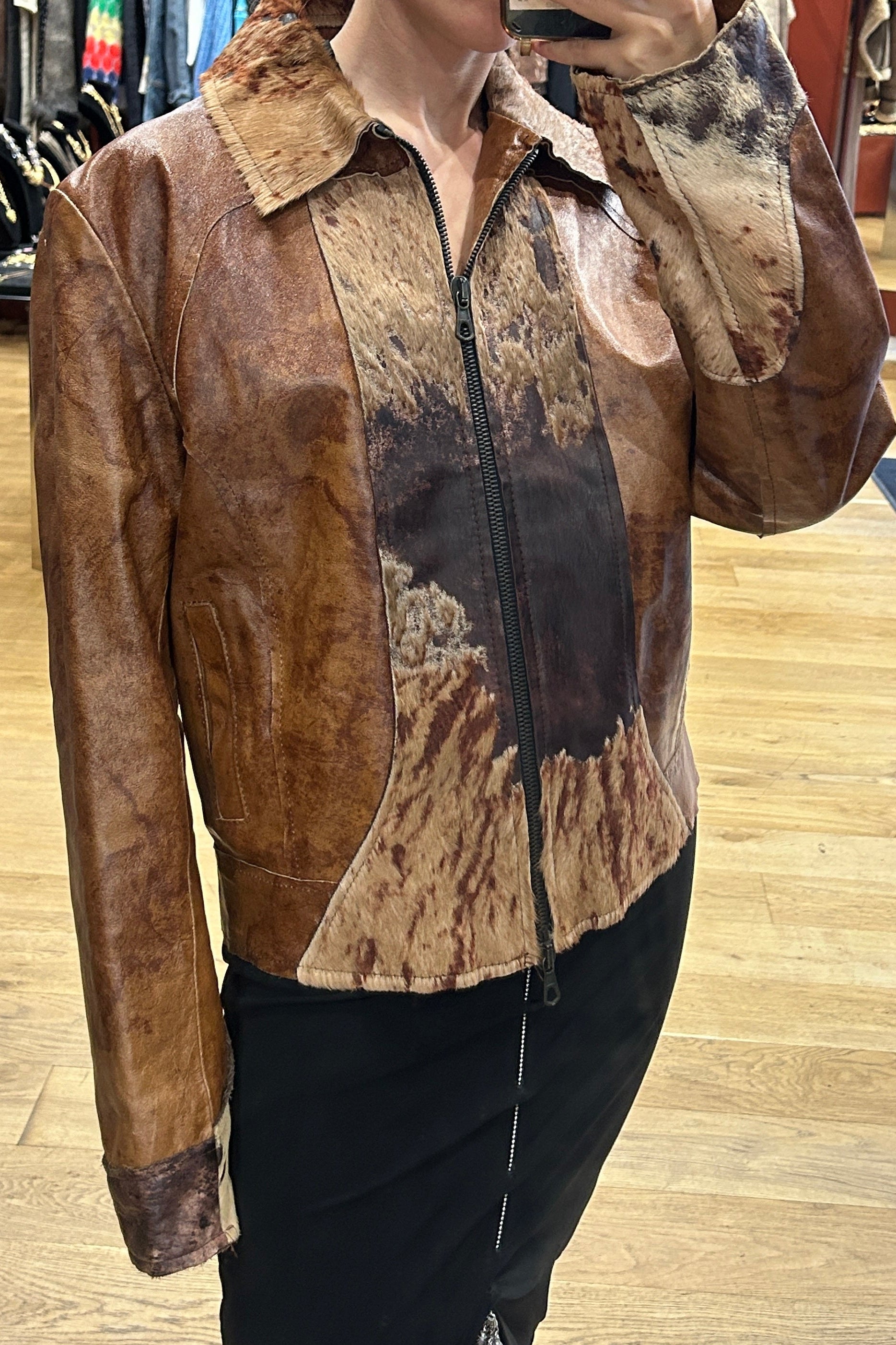 Edgy and sophisticated, this vintage Imperial leather jacket features pony hair panels on the front, sleeves, and collar, adding rich texture and visual depth. Crafted in brown genuine leather, it showcases a double-zip front closure that enhances its modern, structured silhouette.