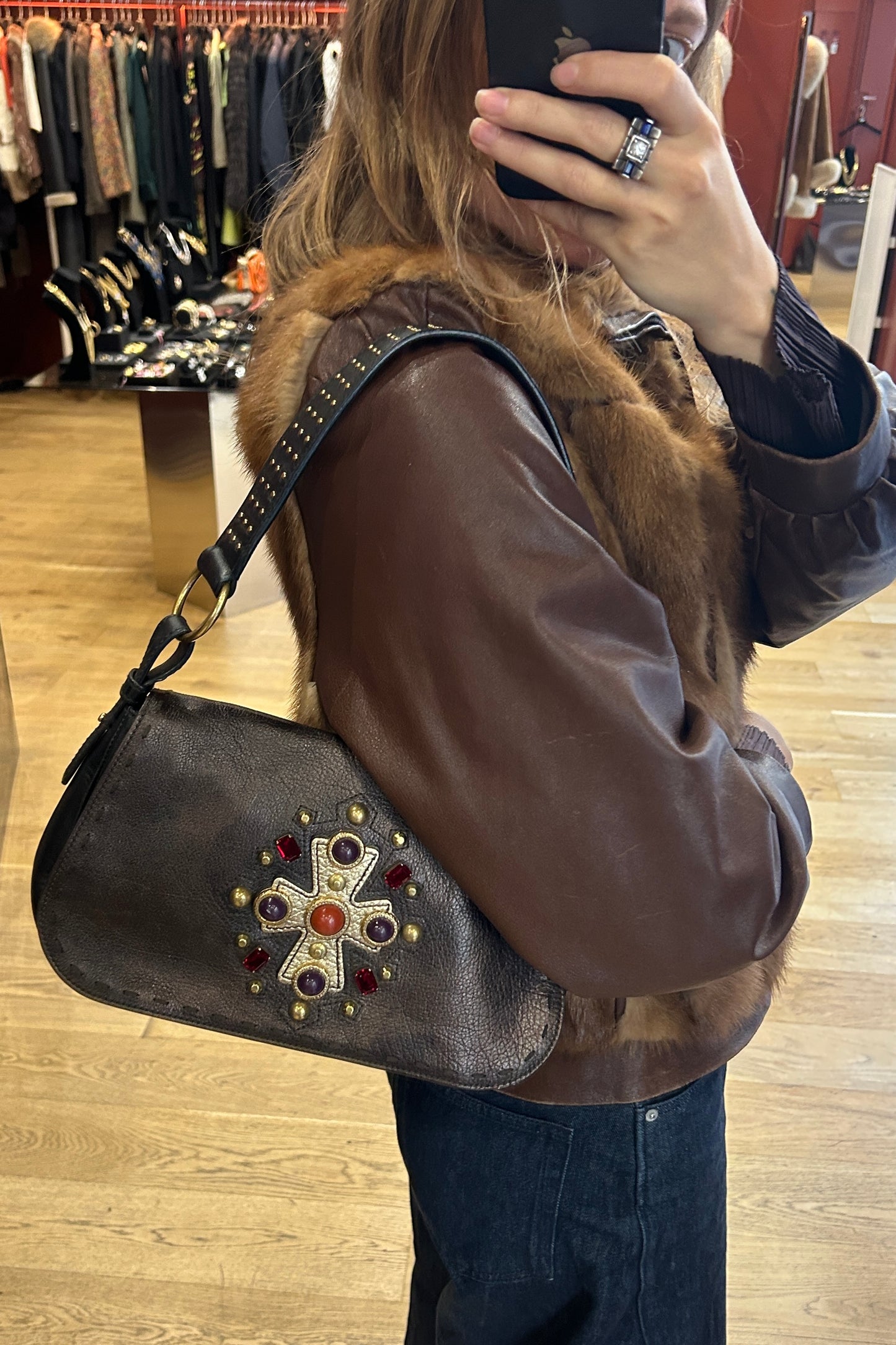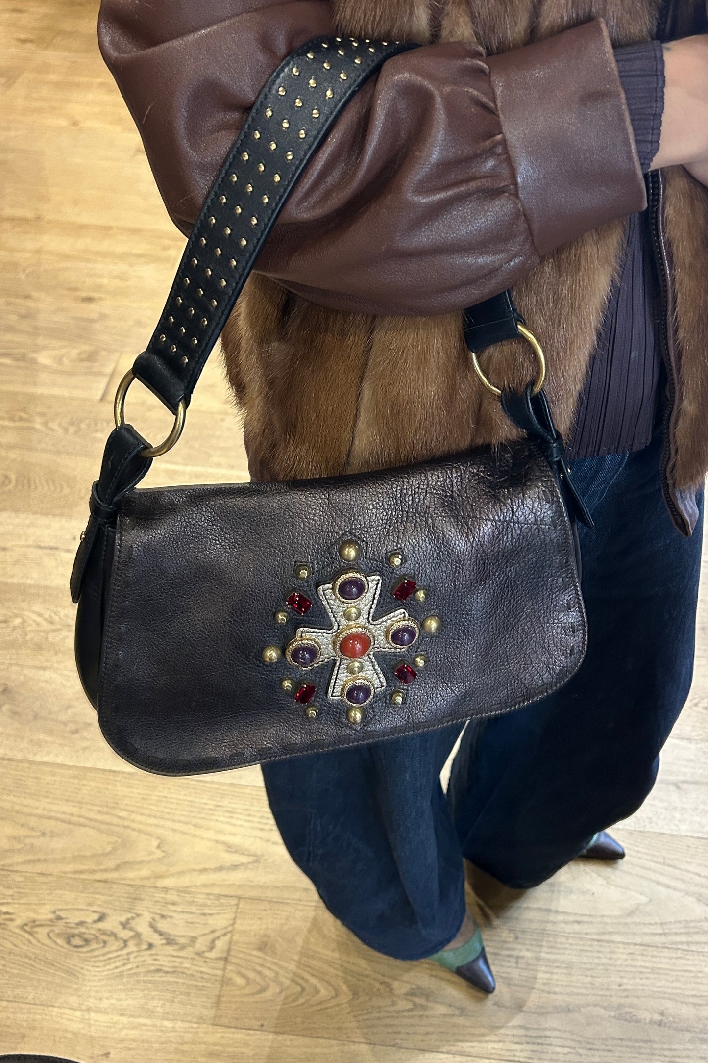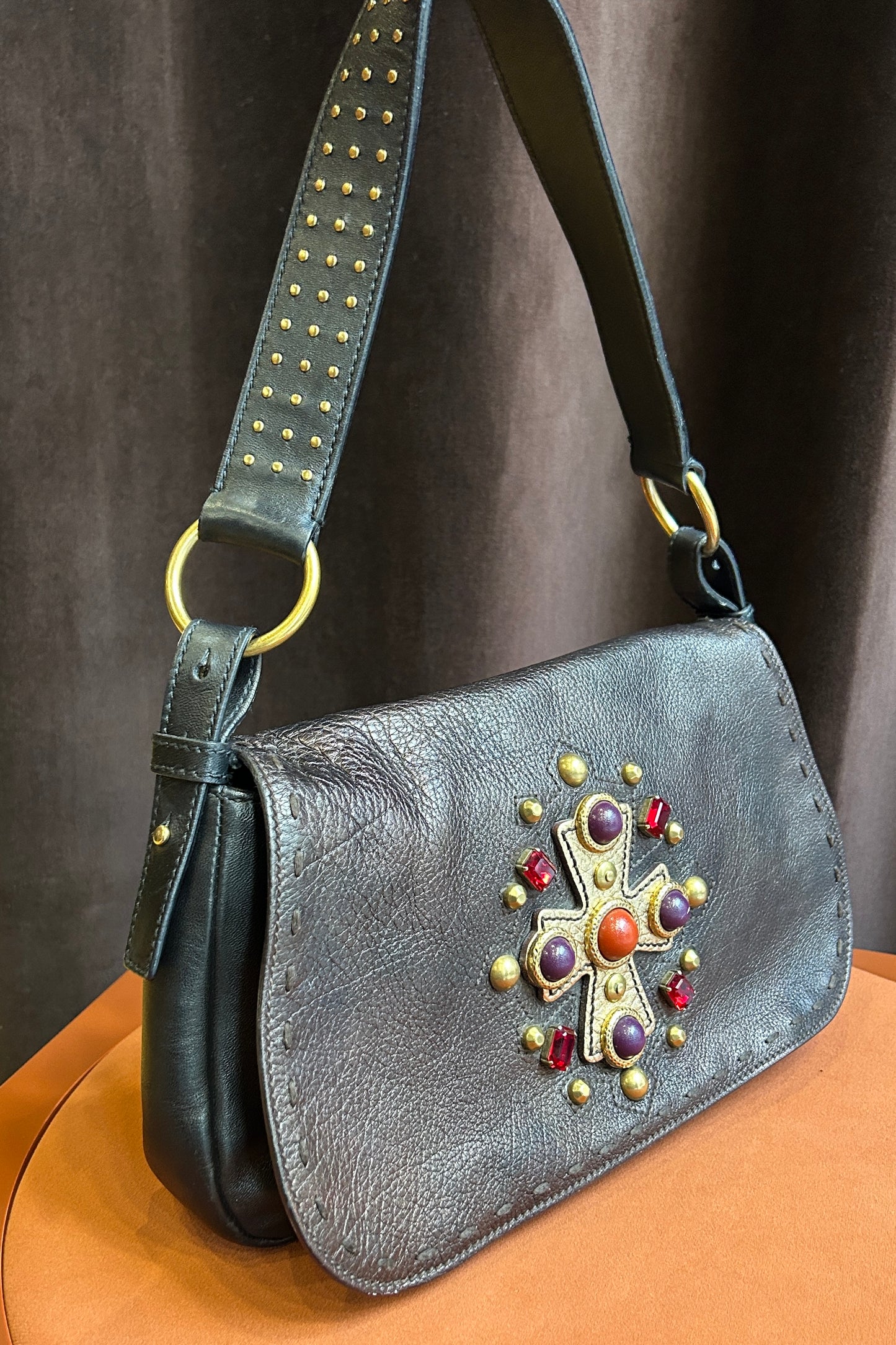 This beautiful Yves Saint Laurent Venice bag from the 2000s is crafted from rich brown leather and features a striking cross detail on the front, formed with decorative jewelry elements that add a bold yet elegant touch. Designed in the perfect everyday size, it is both practical and effortlessly chic. The bag comes with a certificate of authenticity.