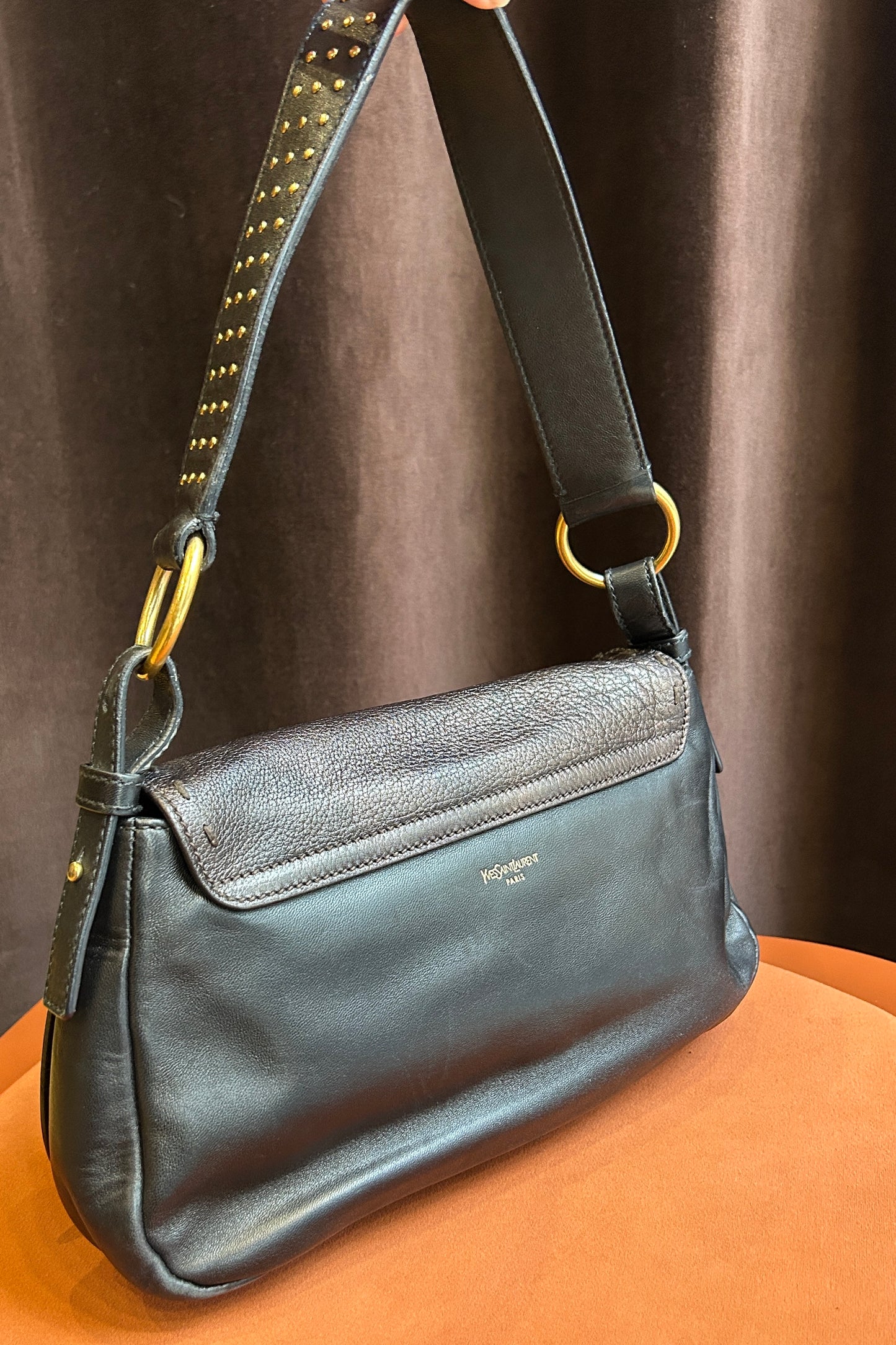 The bag is finished with a studded handle, enhancing its character and giving it a distinctive, fashion-forward edge typical of early 2000s YSL design.