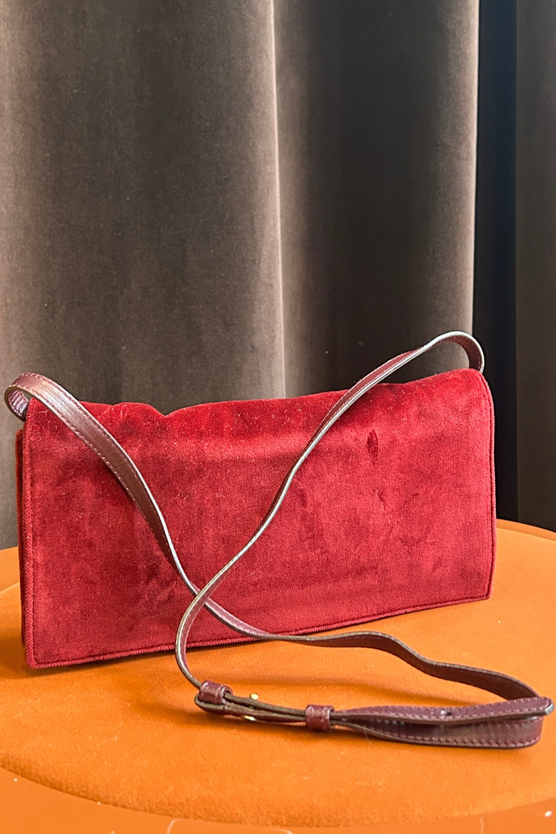 Very cute and elegant, this Yves Saint Laurent bag is crafted from rich burgundy velvet and comes with its certificate of authenticity as well as the original dust bag. Featuring an adjustable strap, it can be worn over the shoulder or styled as a clutch, making it a versatile piece for both day and evening wear.