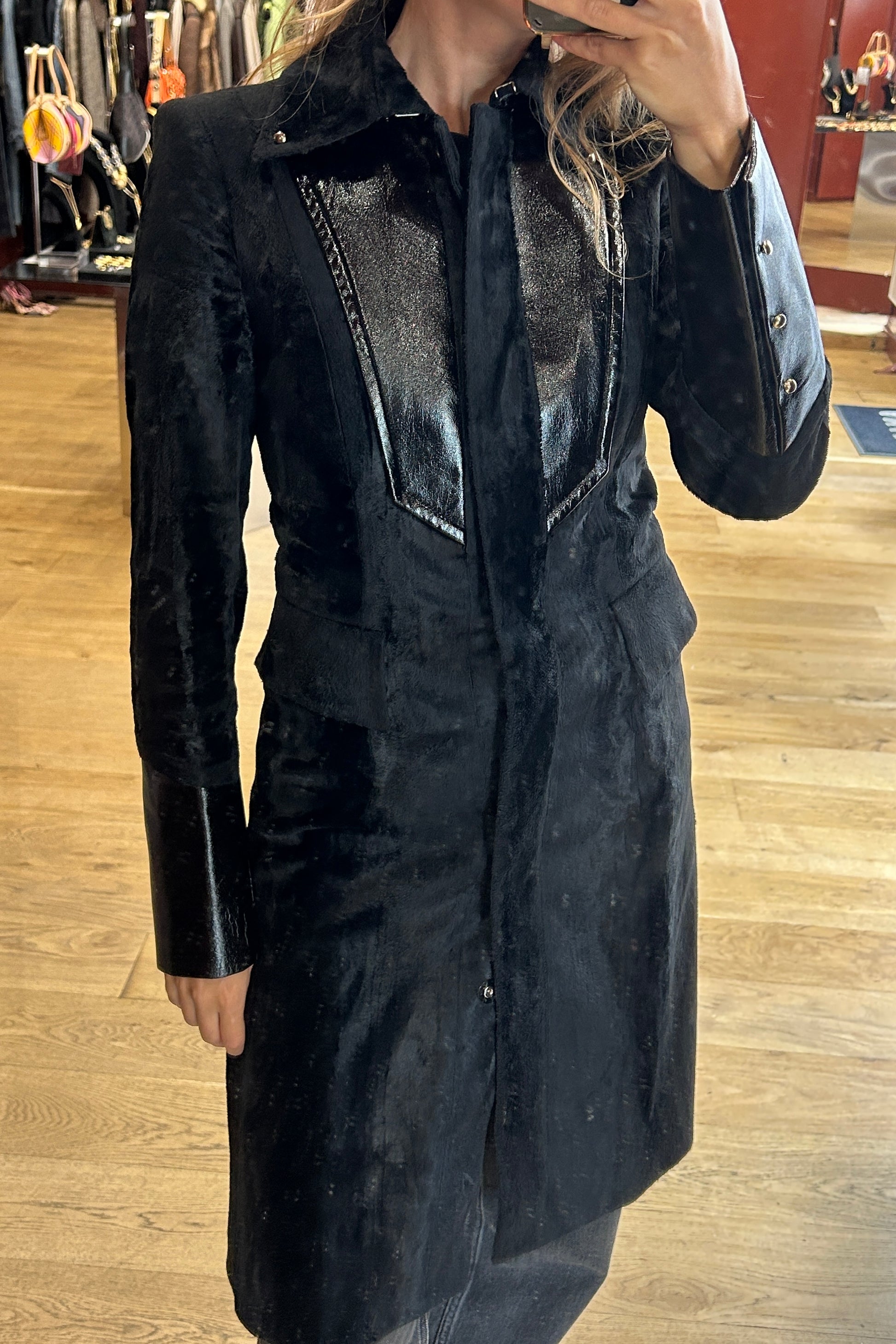 Bold and edgy, this Just Cavalli long coat combines faux leather panels with soft faux fur accents along the front and sleeves, creating a striking, fashion-forward silhouette. Featuring two side pockets for practicality, this coat balances statement style with everyday wearability.