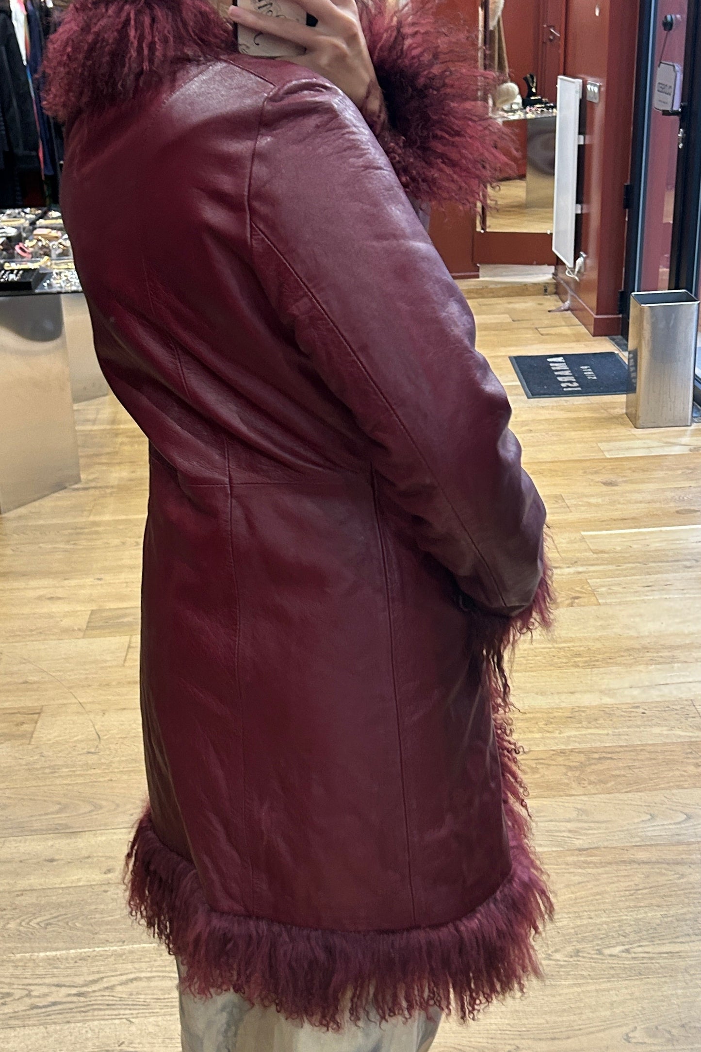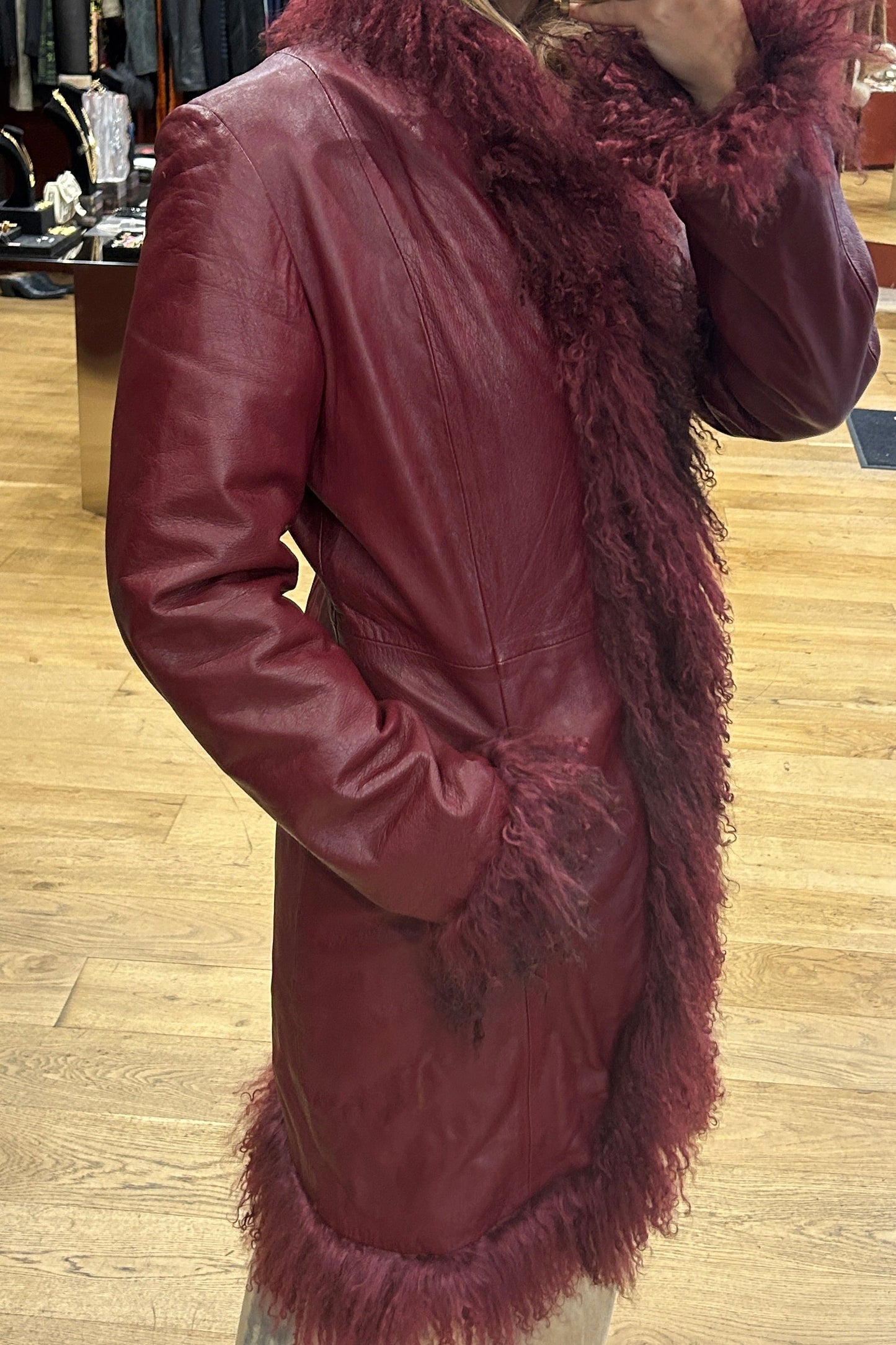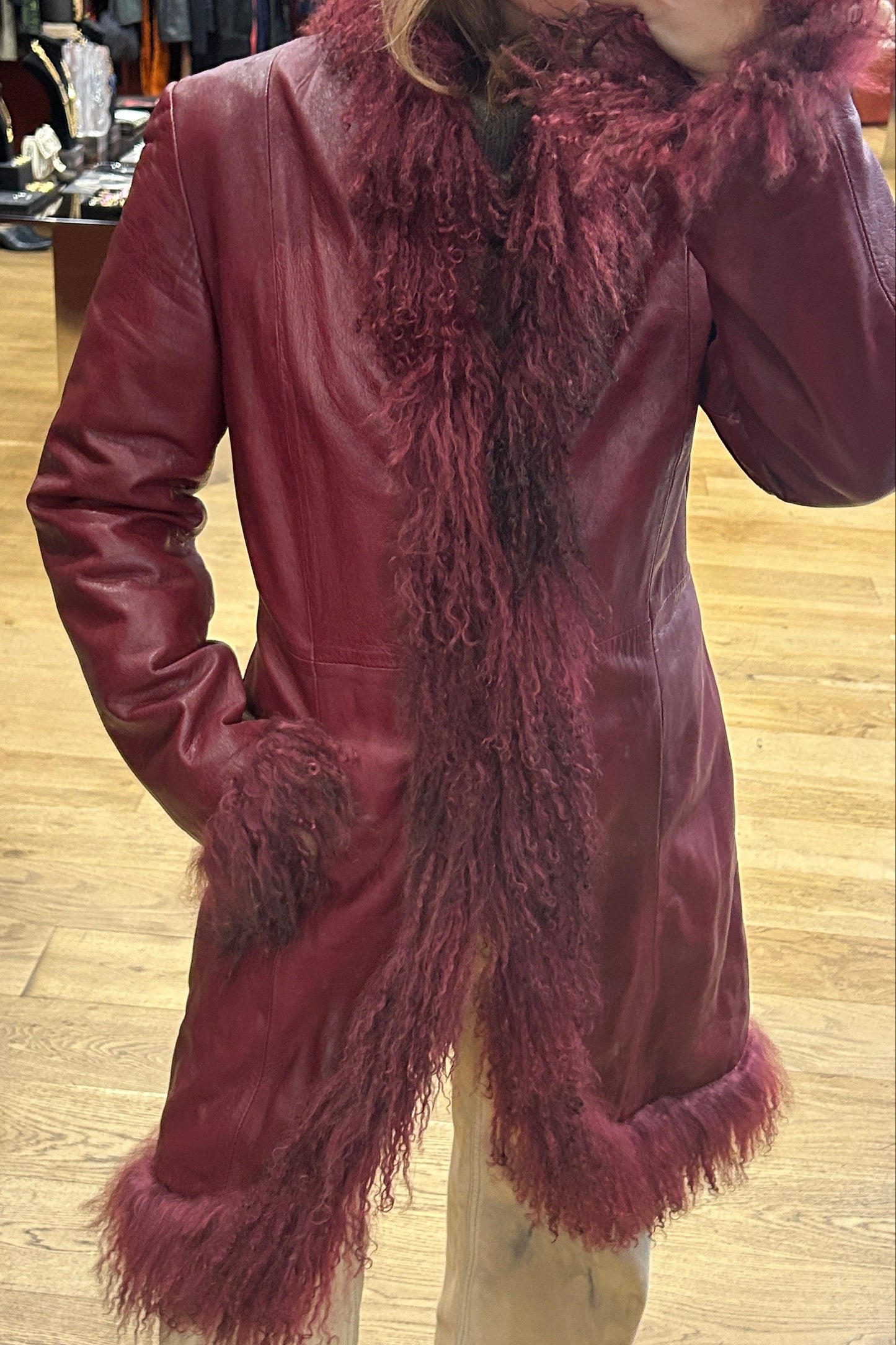 Vintage Burgundy Afghan Leather Jacket with Mongolian Fur
