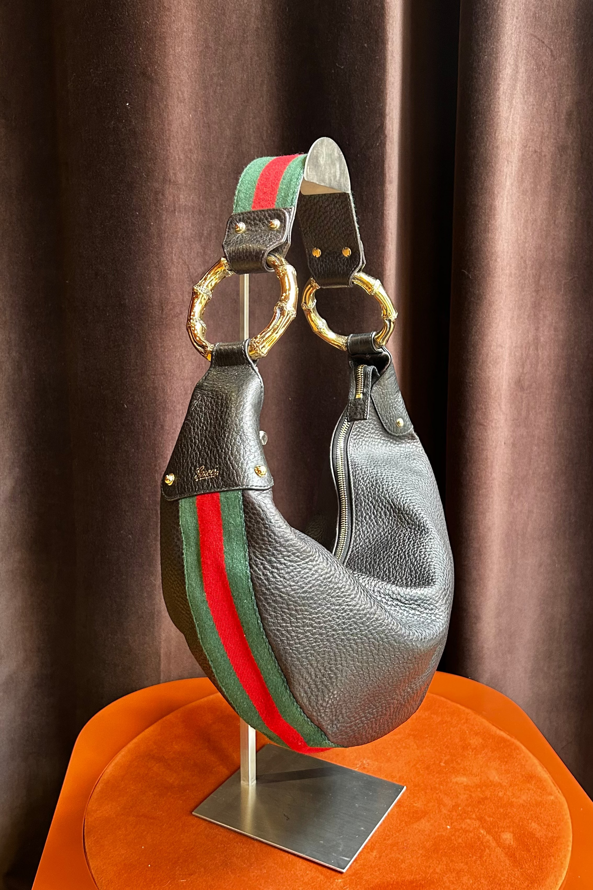 Chic and iconic, this Gucci Hobo Bamboo ring bag is crafted in smooth black leather, featuring the house’s signature green and red web stripe handle for a timeless Gucci touch. The gold-tone metal rings connect the strap to the body of the bag, adding a bold yet refined finish.
