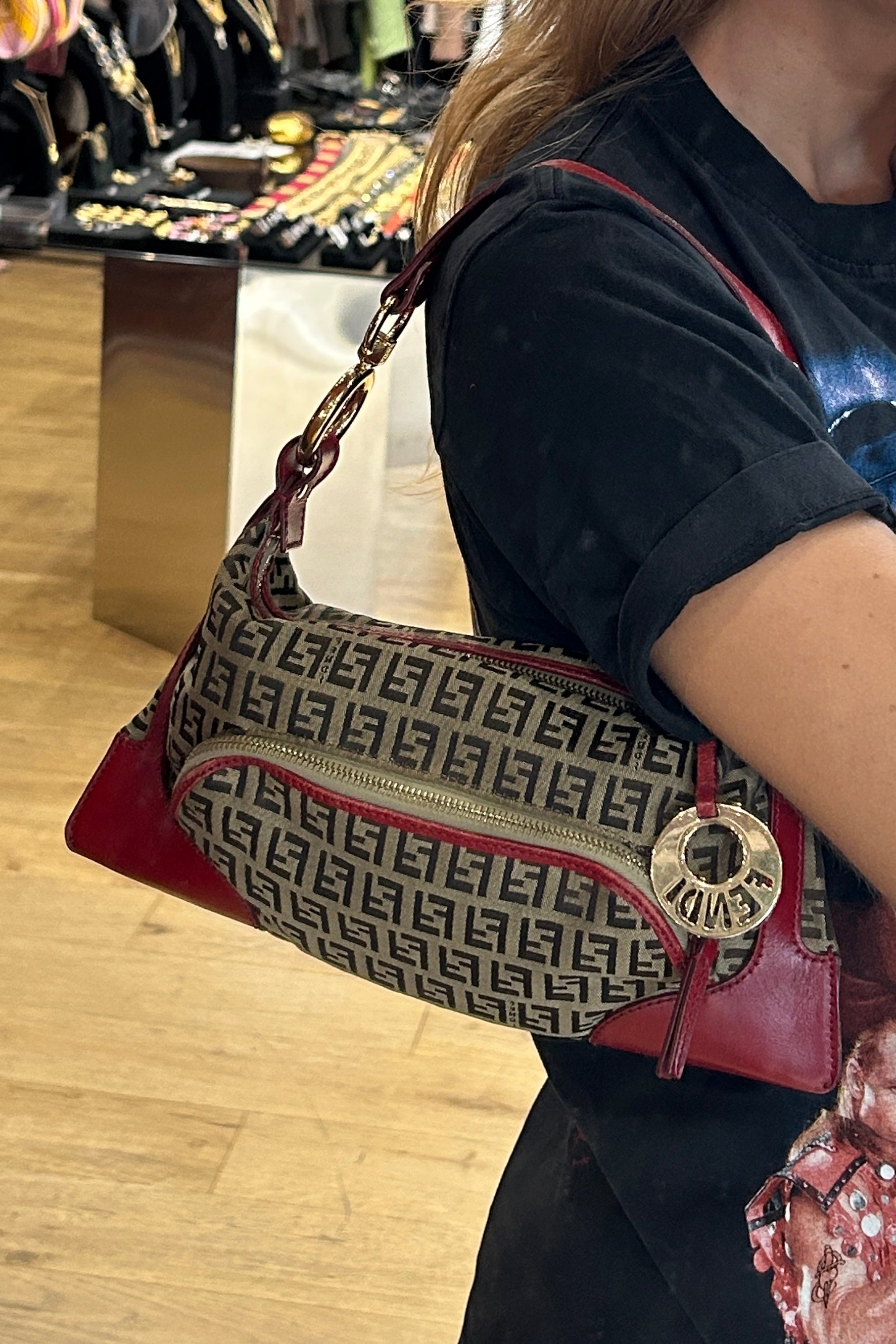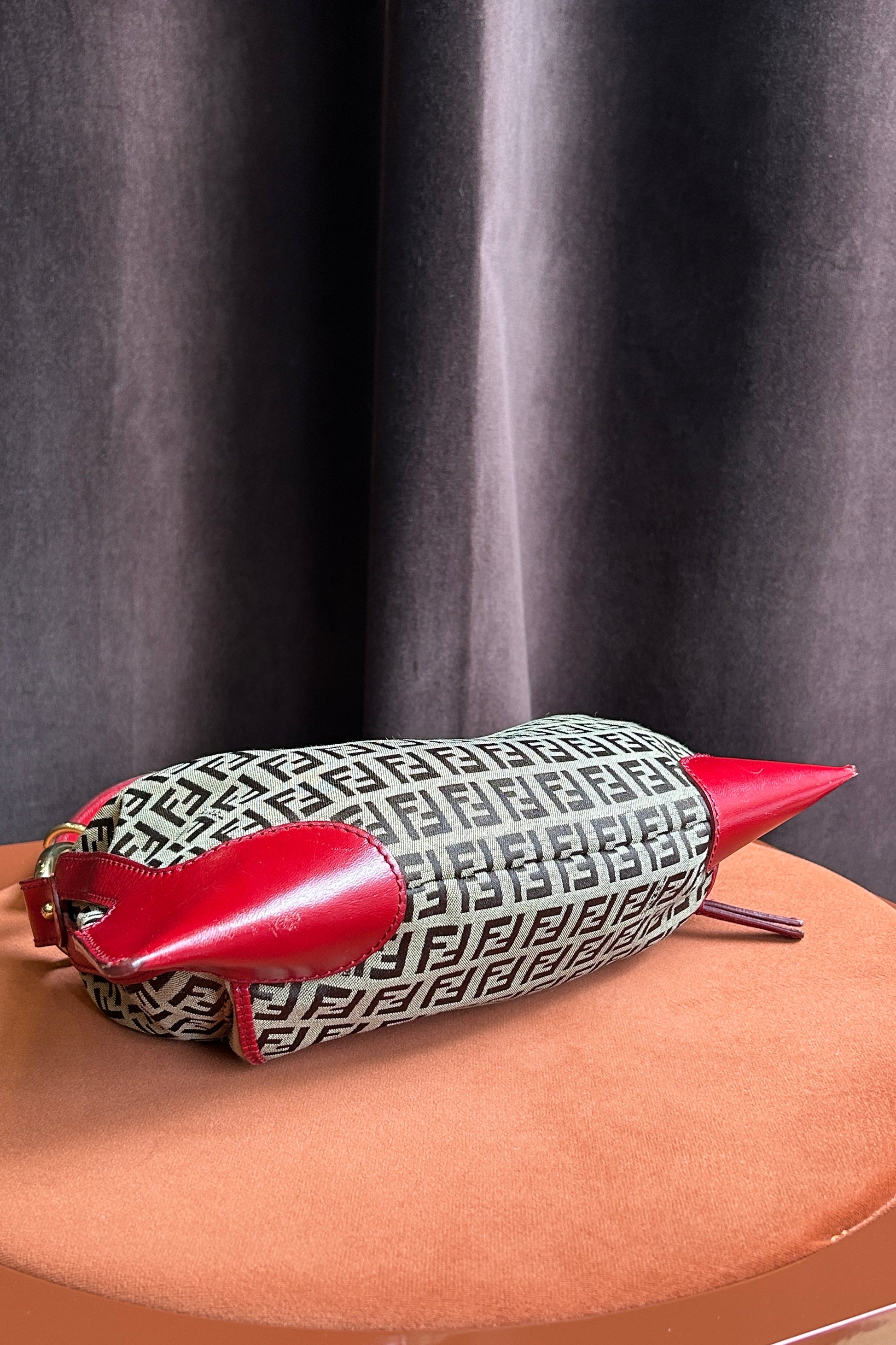 Bold yet refined, this Fendi Chef Pocket Hobo is crafted in classic brown Zucchino monogram canvas, accented with striking red leather panels. A curved hobo silhouette and structured leather strap with a gold-tone ring complete the design, embodying the effortless sophistication of early-2000s Fendi.